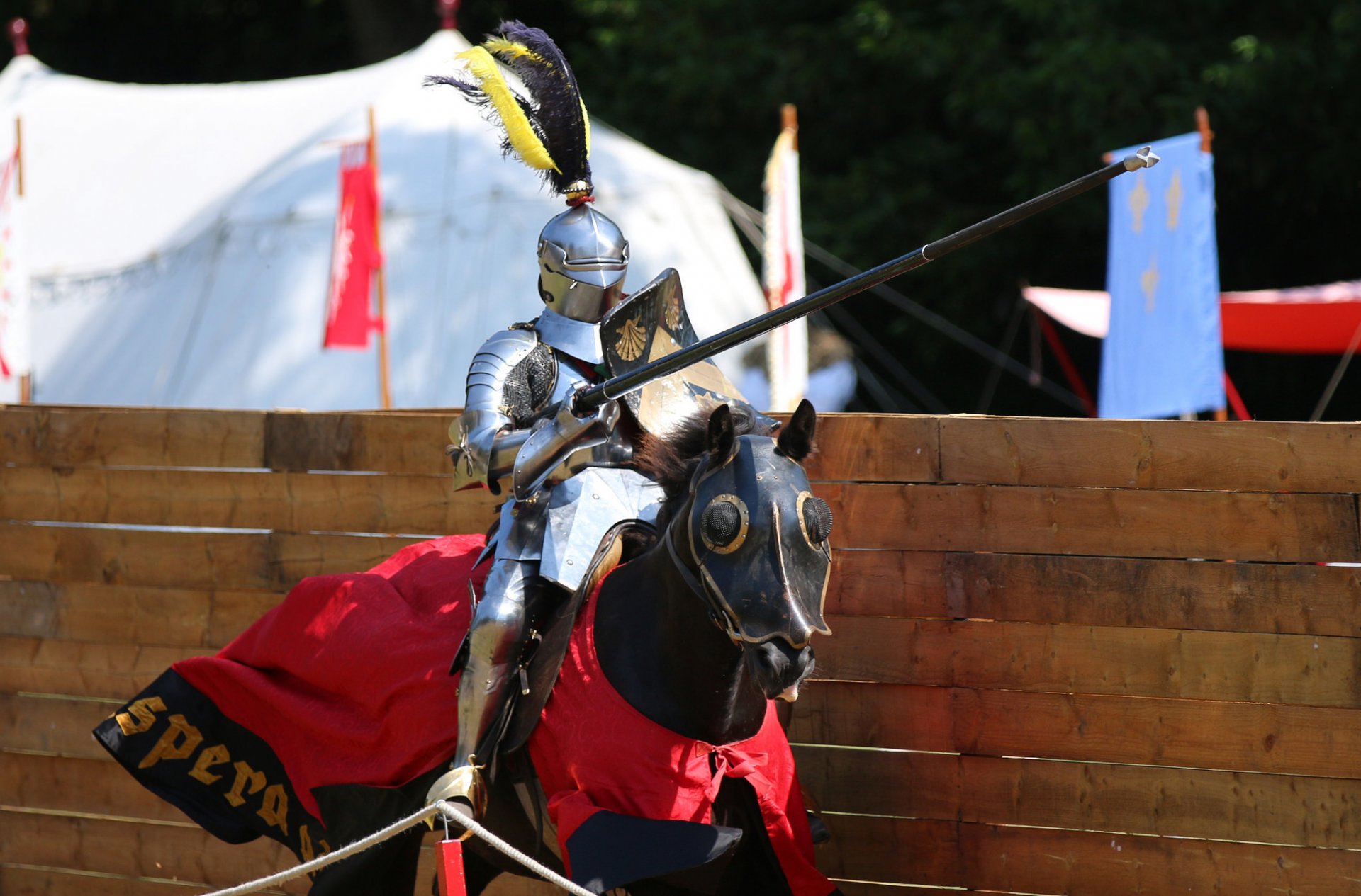 Ein ritter in rüstung auf einem pferd und ein mädchenEin Ritter in Rüstung auf einem Pferd und ein Mädchen