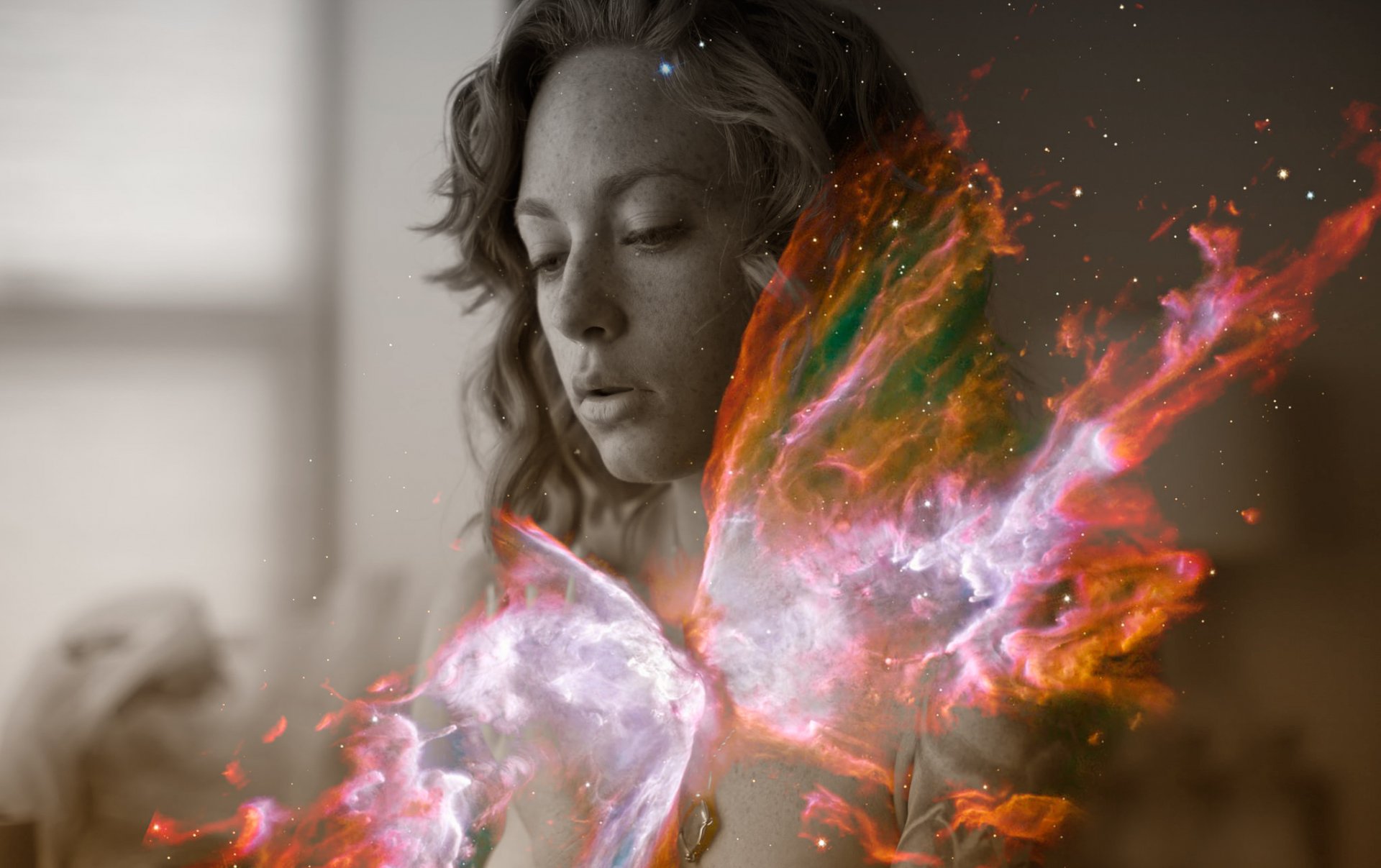 Farbexplosion auf dem hintergrund eines monochromen bildes eines mädchensFarbexplosion auf dem Hintergrund eines monochromen Bildes eines Mädchens
