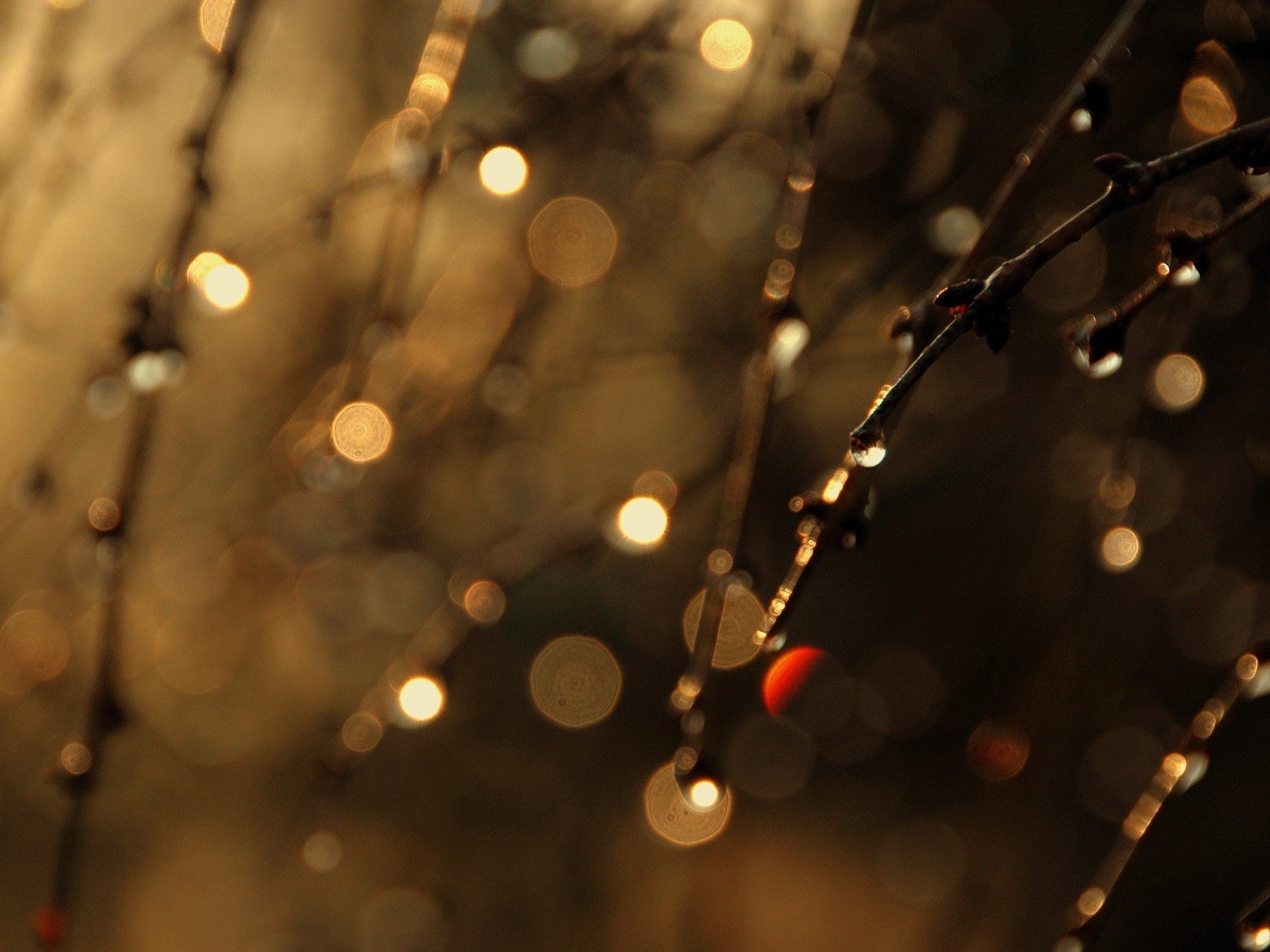 Tröpfchen an den Zweigen. Verschwommenes Bild