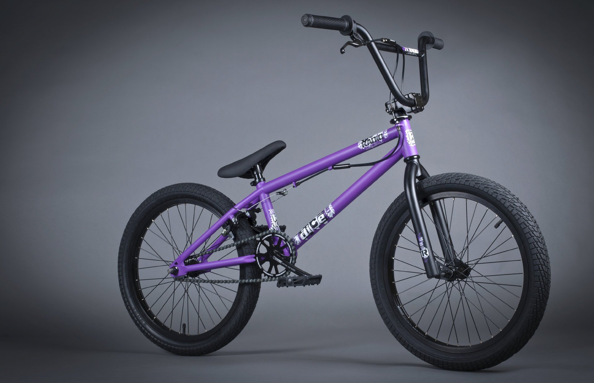 Grau mit lila Griffen bmx Fahrrad auf grauem Hintergrund