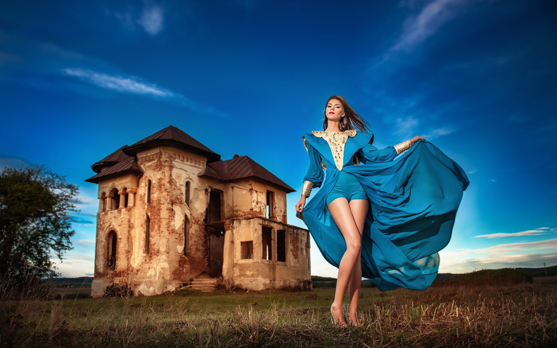Mädchen im blauen Kleid vor dem Hintergrund des Schlosses