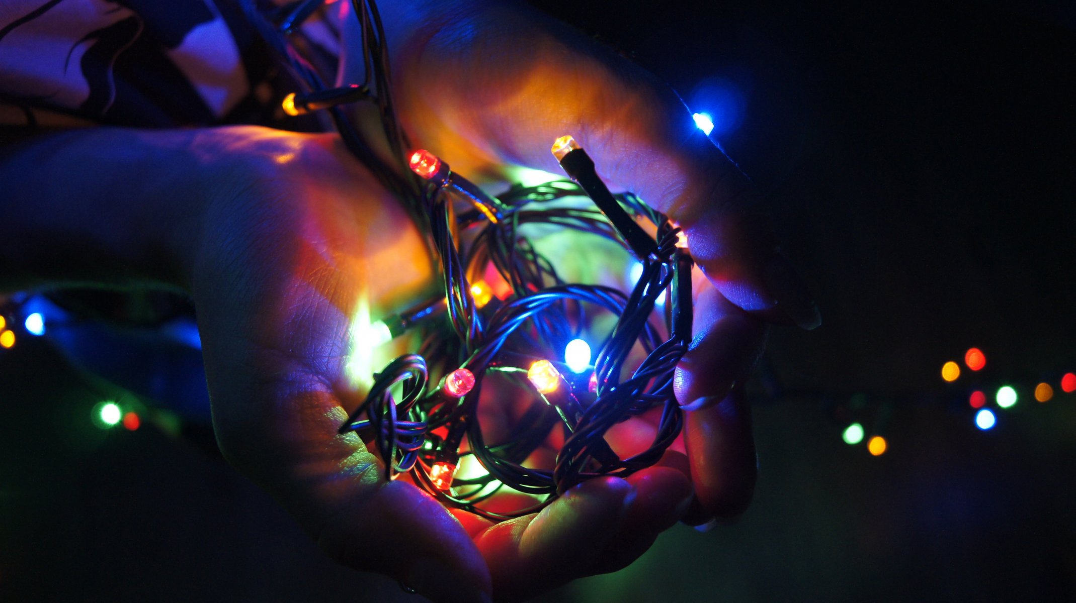 Weihnachtsbeleuchtung auf den handflächen im dunkelnWeihnachtsbeleuchtung auf den Handflächen im Dunkeln