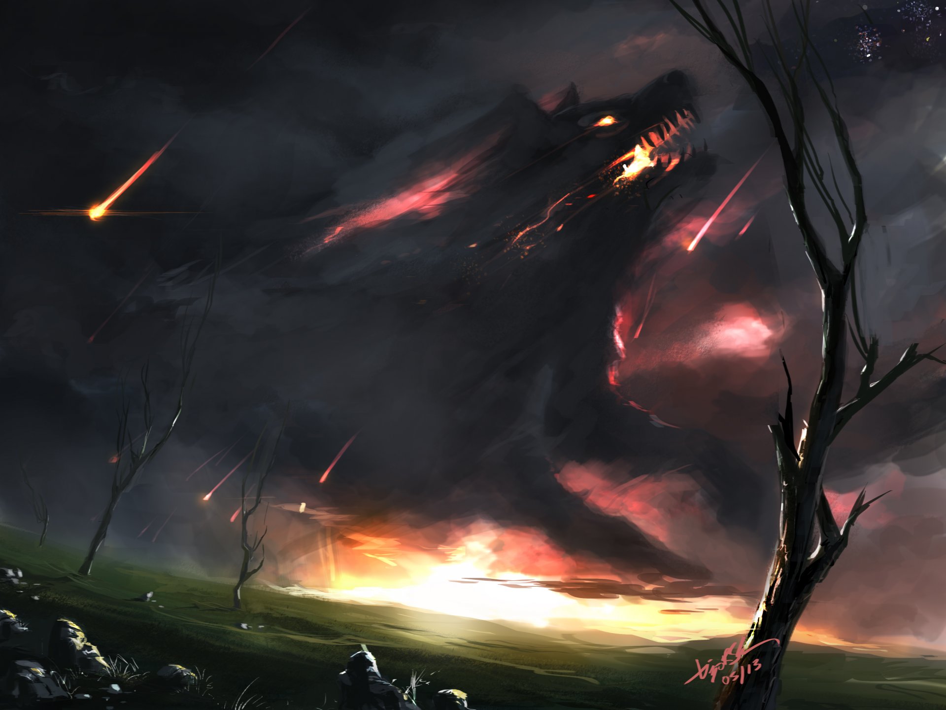 Ein schreckliches monster und ein mädchen mit einem feuer in der handEin schreckliches Monster und ein Mädchen mit einem Feuer in der Hand