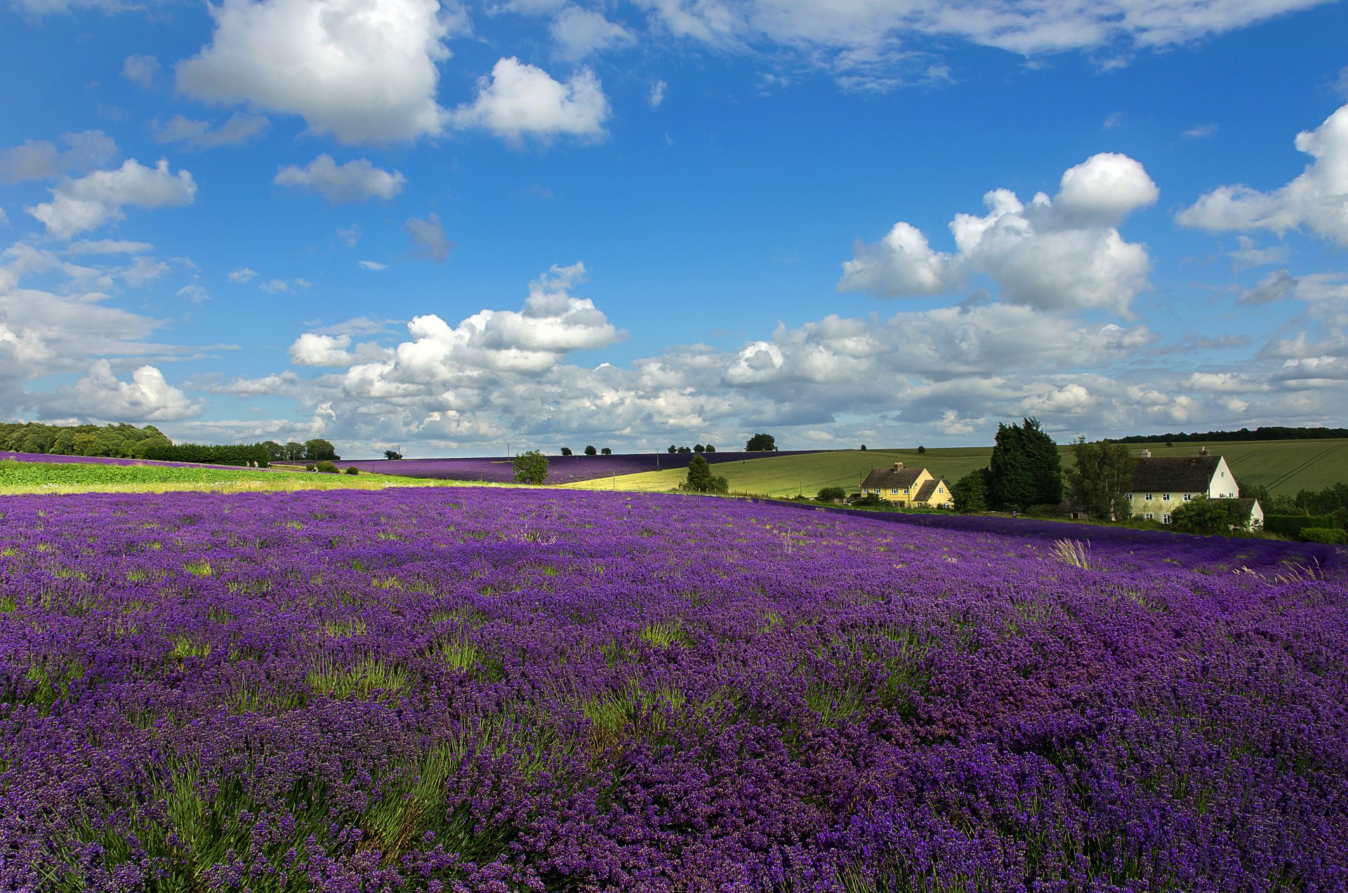 Ein tag auf einem lavendelfeld unter blauem himmel mit weißen wolkenEin Tag auf einem Lavendelfeld unter blauem Himmel mit weißen Wolken