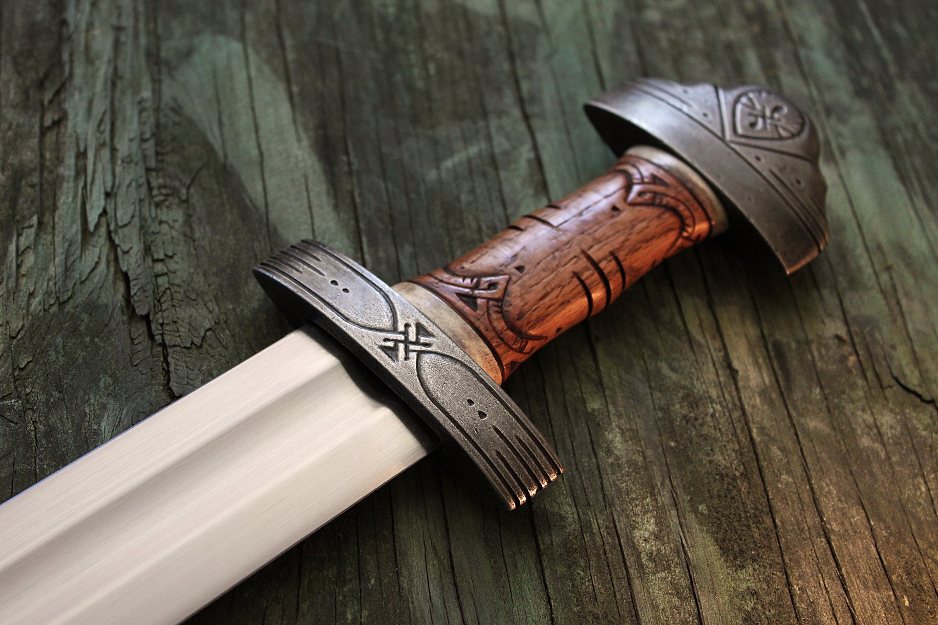 Ein schwert mit scheide liegt auf einer holzoberflächeEin Schwert mit Scheide liegt auf einer Holzoberfläche