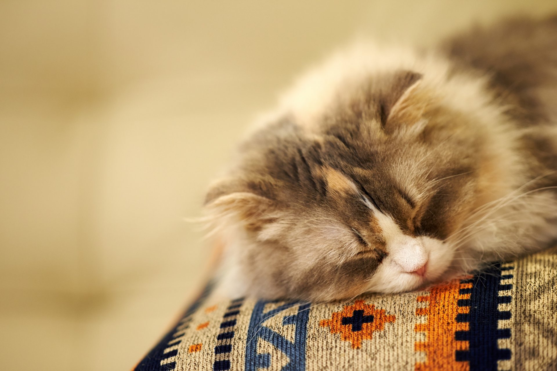 Flauschige Katze schläft friedlich auf einem farbigen Kissen