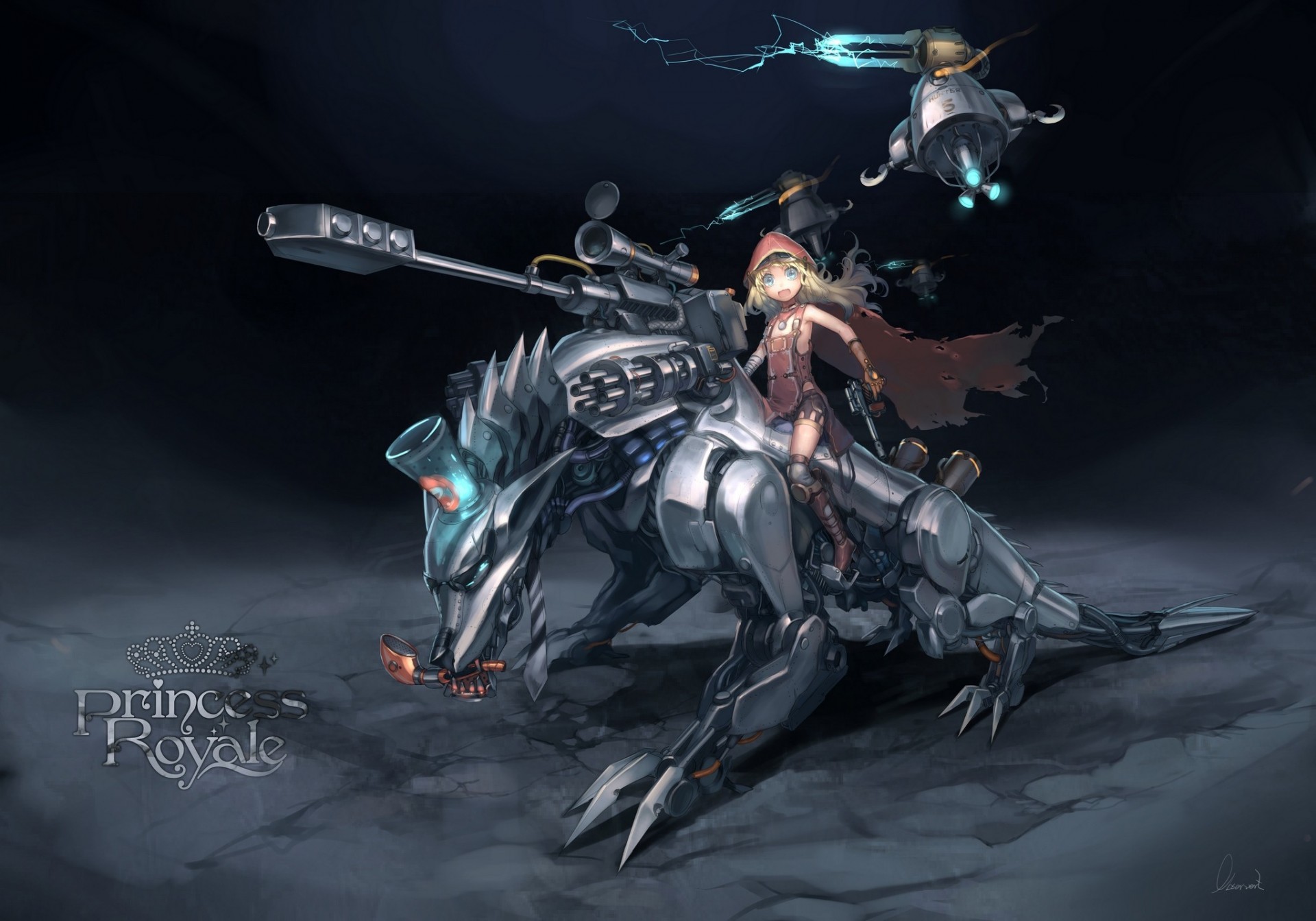 Die heldin in rotkäppchen und umhang reitet einen drachen in rüstungDie Heldin in Rotkäppchen und Umhang reitet einen Drachen in Rüstung