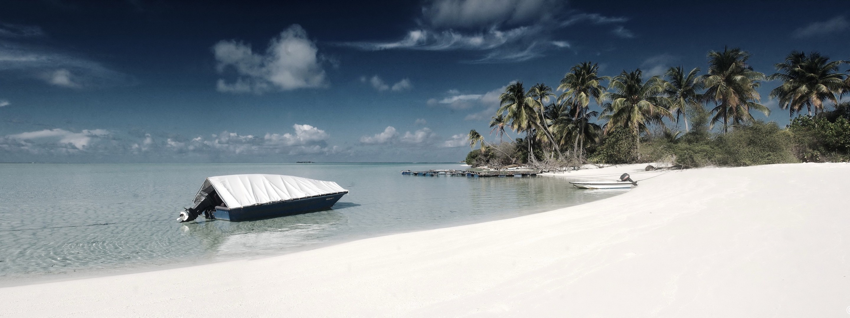 Sowjetisches blaues auto mit boot auf dem dach am sandigen ufer des ozeans unter palmen vor dem hintergrund des blauen himmelsSowjetisches blaues Auto mit Boot auf dem Dach am sandigen Ufer des Ozeans unter Palmen vor dem Hintergrund des blauen Himmels