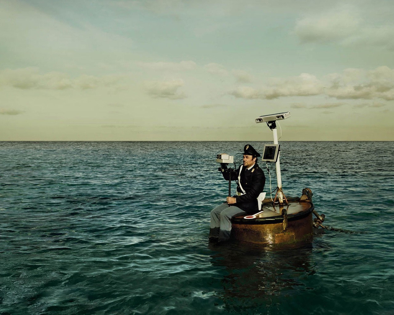 Verkehrspolizeiinspektor auf einem fass im meer mit radarVerkehrspolizeiinspektor auf einem Fass im Meer mit Radar