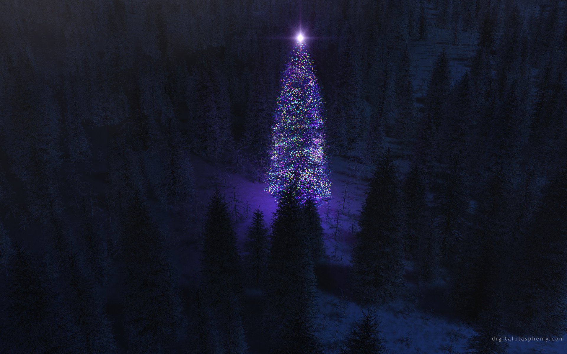 Weihnachtsbaum mit lichtern in der nacht im dunklen waldWeihnachtsbaum mit Lichtern in der Nacht im dunklen Wald