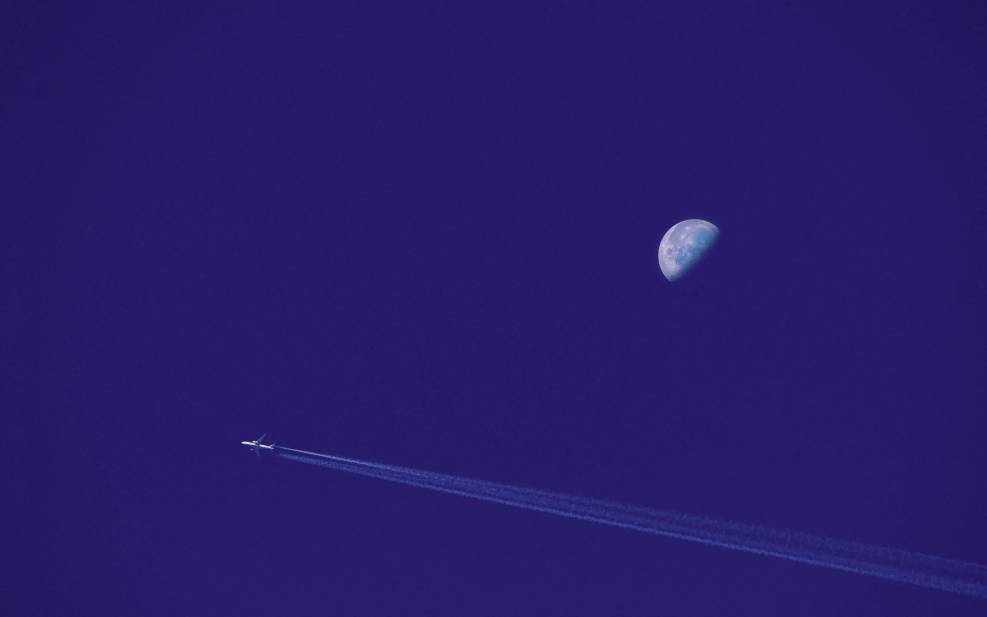 Ein passagierflugzeug am himmel, das am mond vorbeifährt, hinterlässt eine invertierte spurEin Passagierflugzeug am Himmel, das am Mond vorbeifährt, hinterlässt eine invertierte Spur