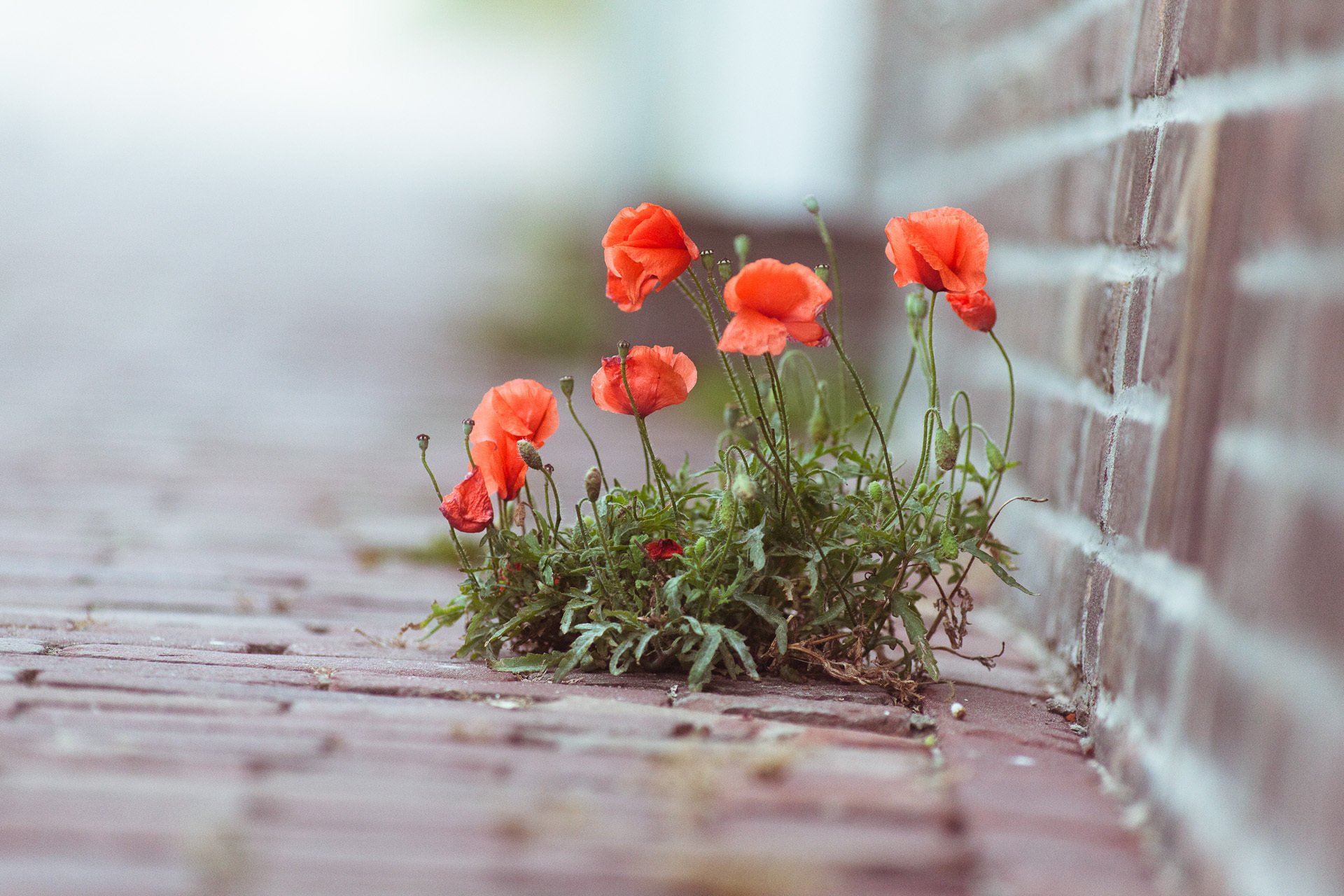 Rote mohnblumen, die sich durch die fliesen schlagenRote Mohnblumen, die sich durch die Fliesen schlagen