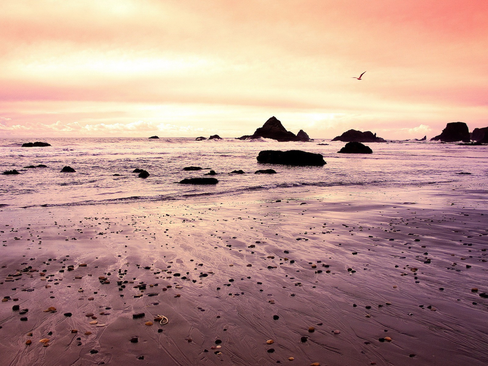 Flut am Strand. Möwe im Flug am Horizont