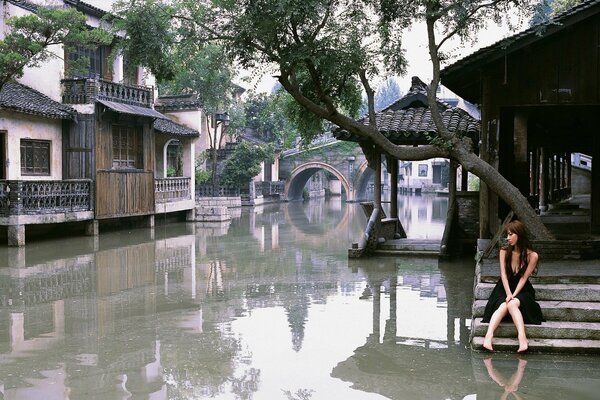Mädchen im schwarzen kleid inmitten der flut