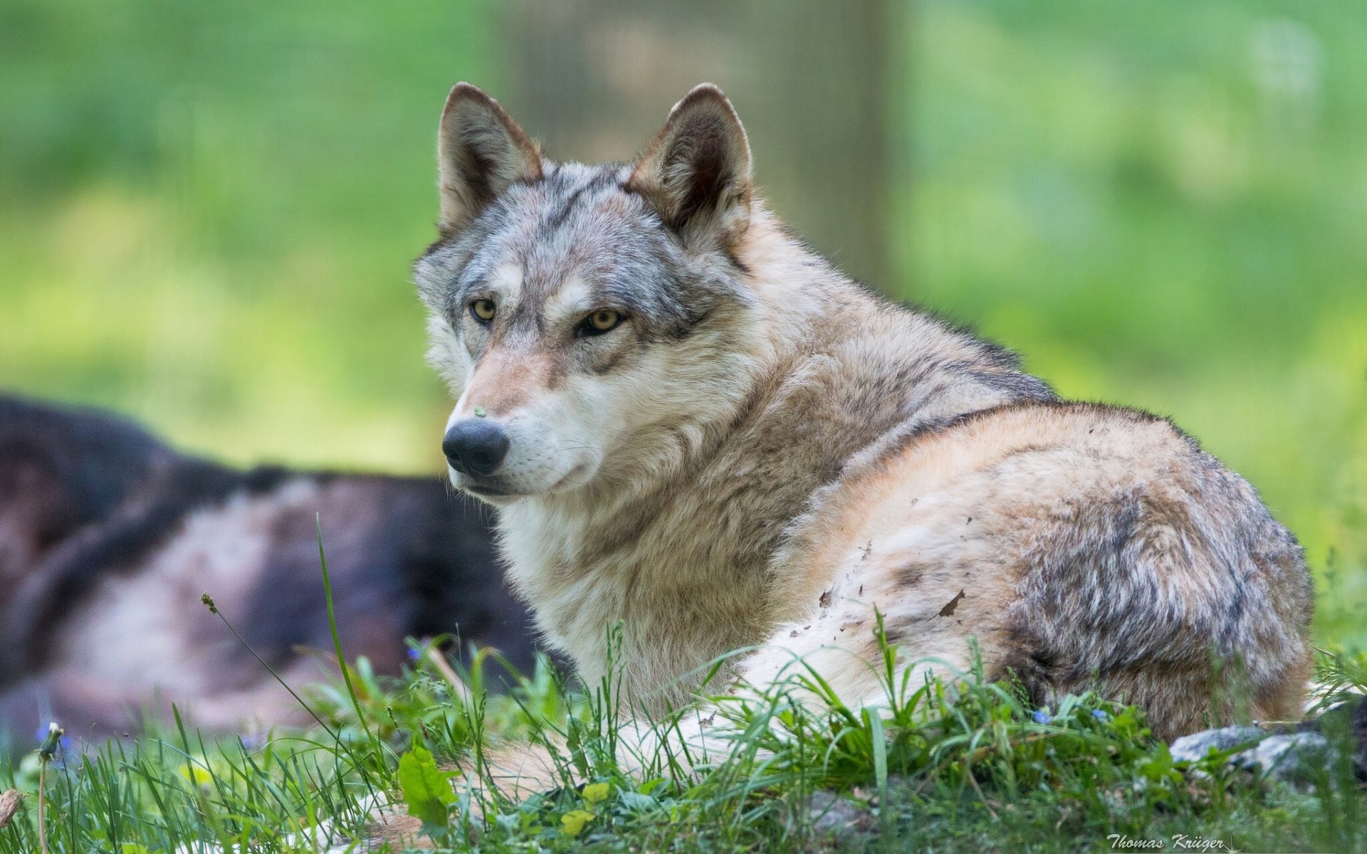 Grauer wolf schaut auf verschwommenem hintergrund zur seiteGrauer Wolf schaut auf verschwommenem Hintergrund zur Seite