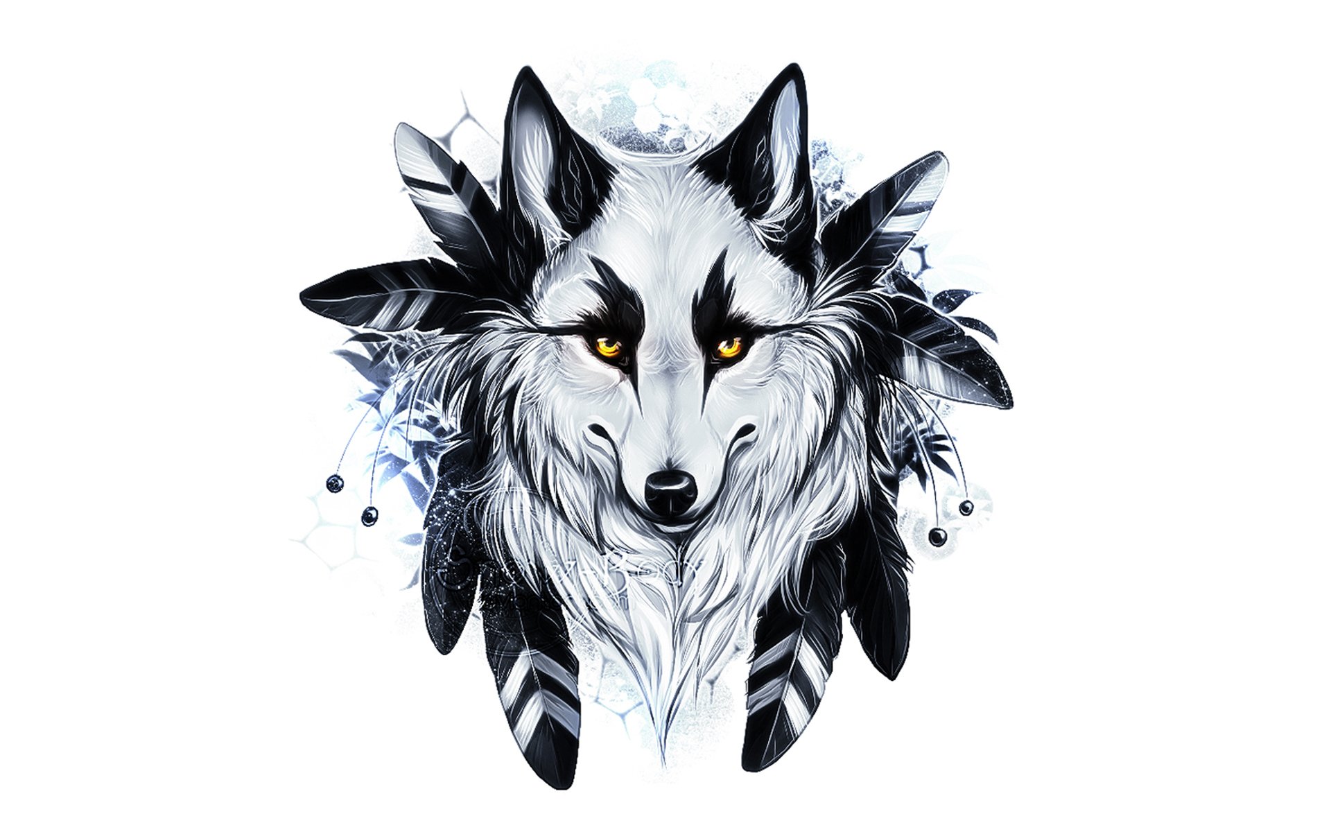 Rote blüten zu füßen eines weißen wolfes im winterRote Blüten zu Füßen eines weißen Wolfes im Winter