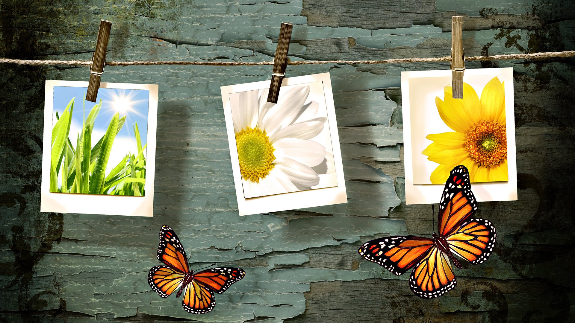 Bilder von Blumen und Gras am Seil mit Zeichen