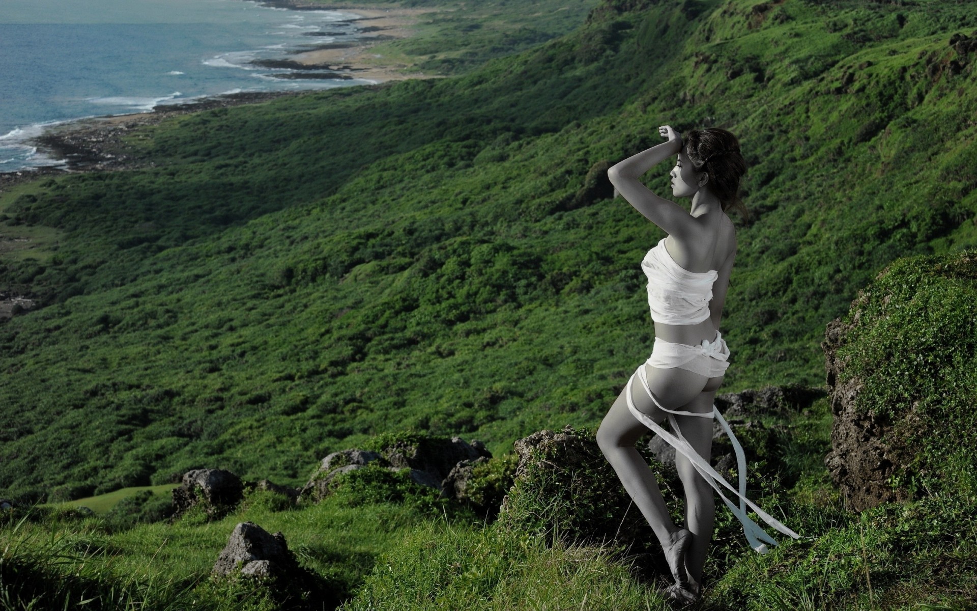 Asiatische frau an der stehenden küste in bandagenAsiatische Frau an der stehenden Küste in Bandagen