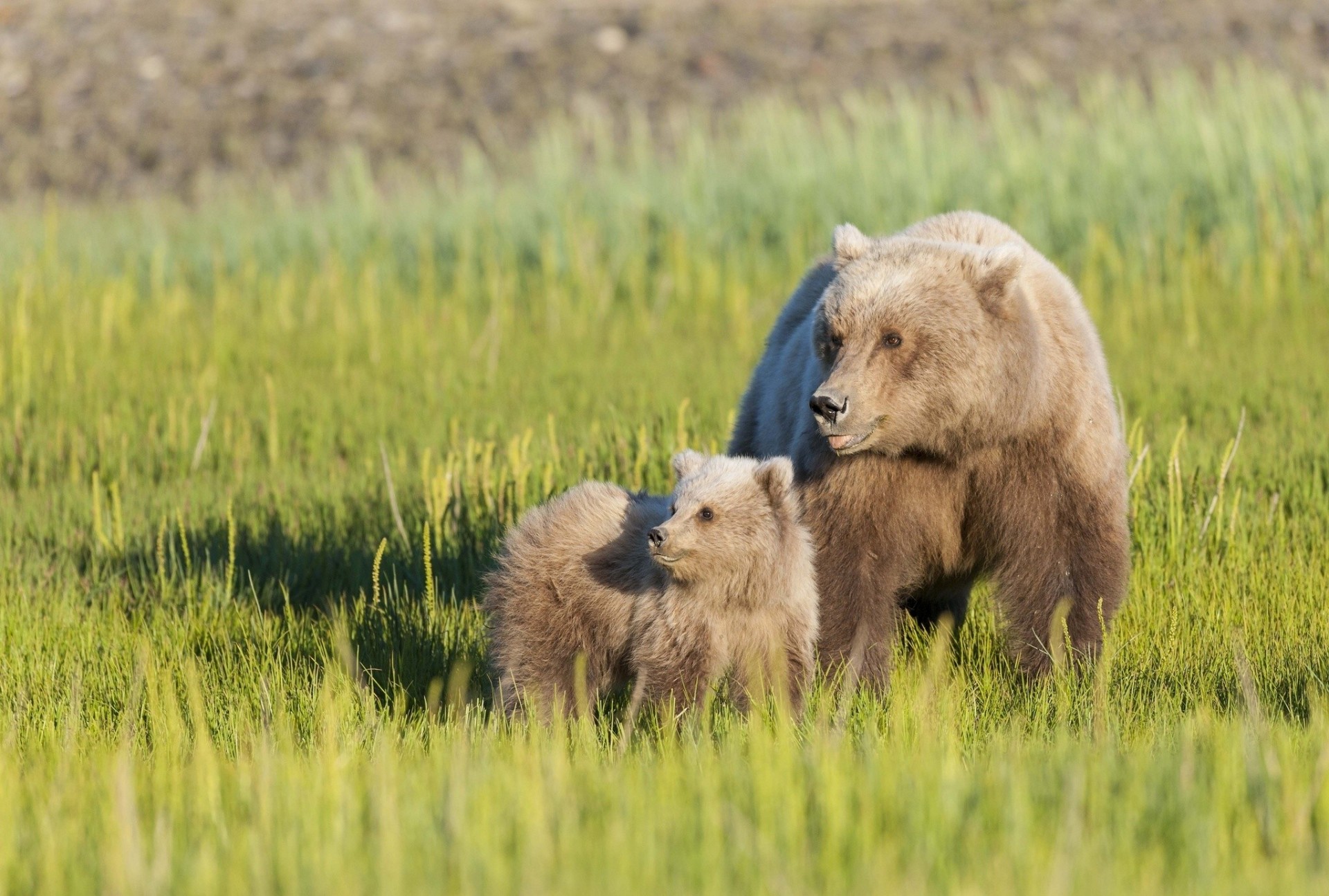 Ein Bär auf einem hölzernen Hanf spielt mit einem anderen Bären