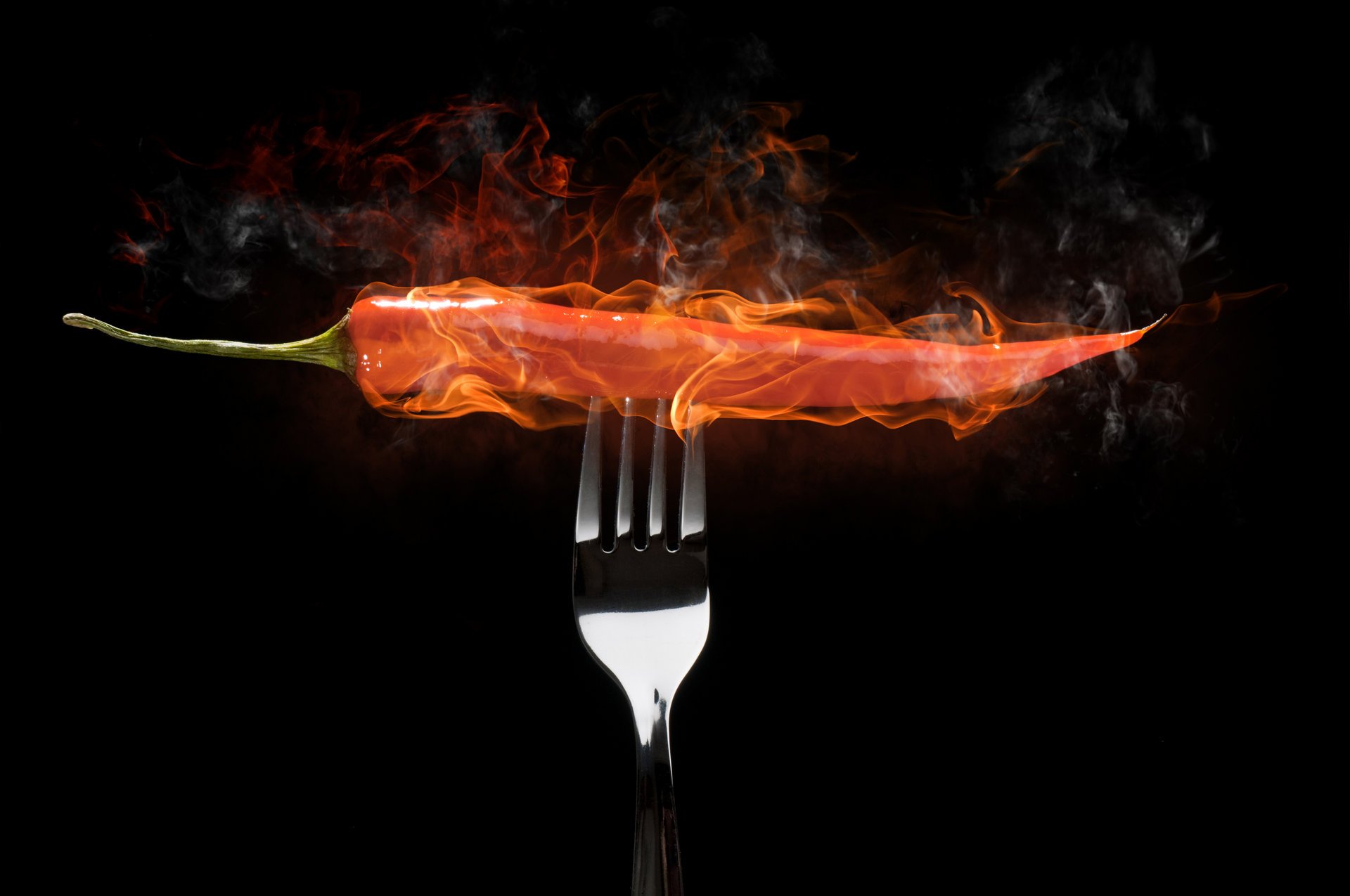 Rote Erdbeeren auf einer Gabel auf schwarzem Hintergrund