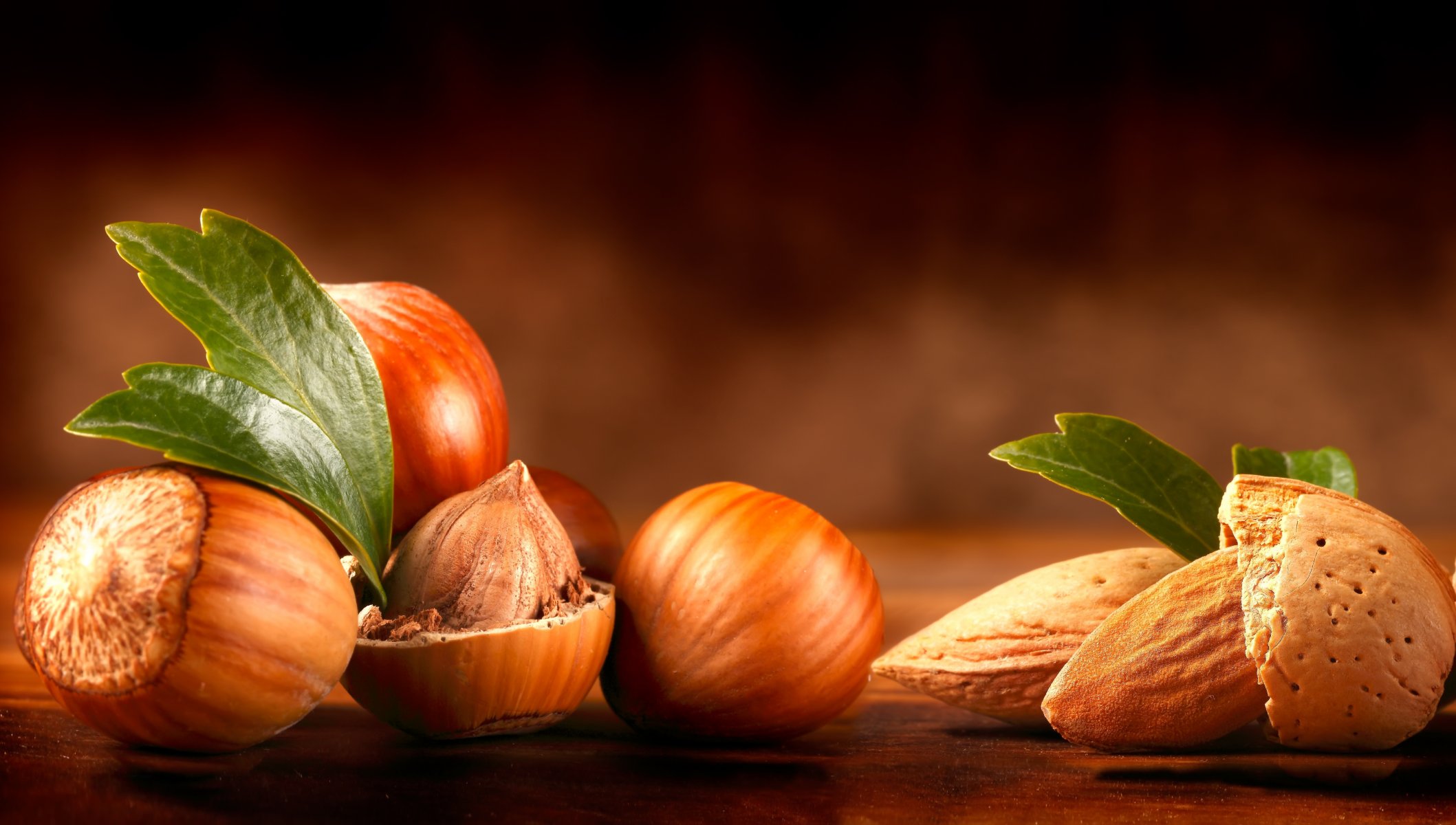 Haselnüsse und Mandeln mit Blättern auf dem Tisch