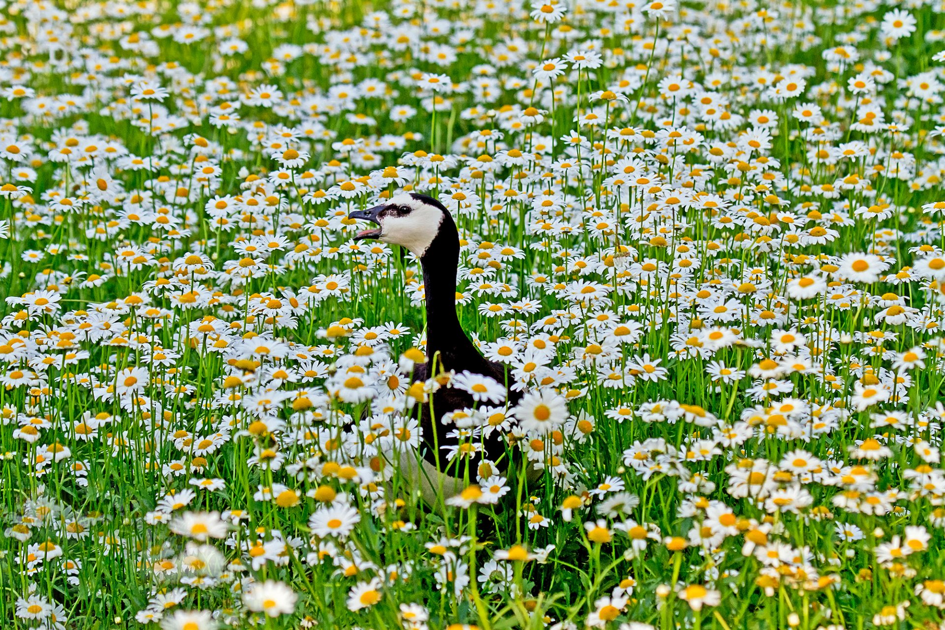 Gänse mit offenem Schnabel unter Gänseblümchen