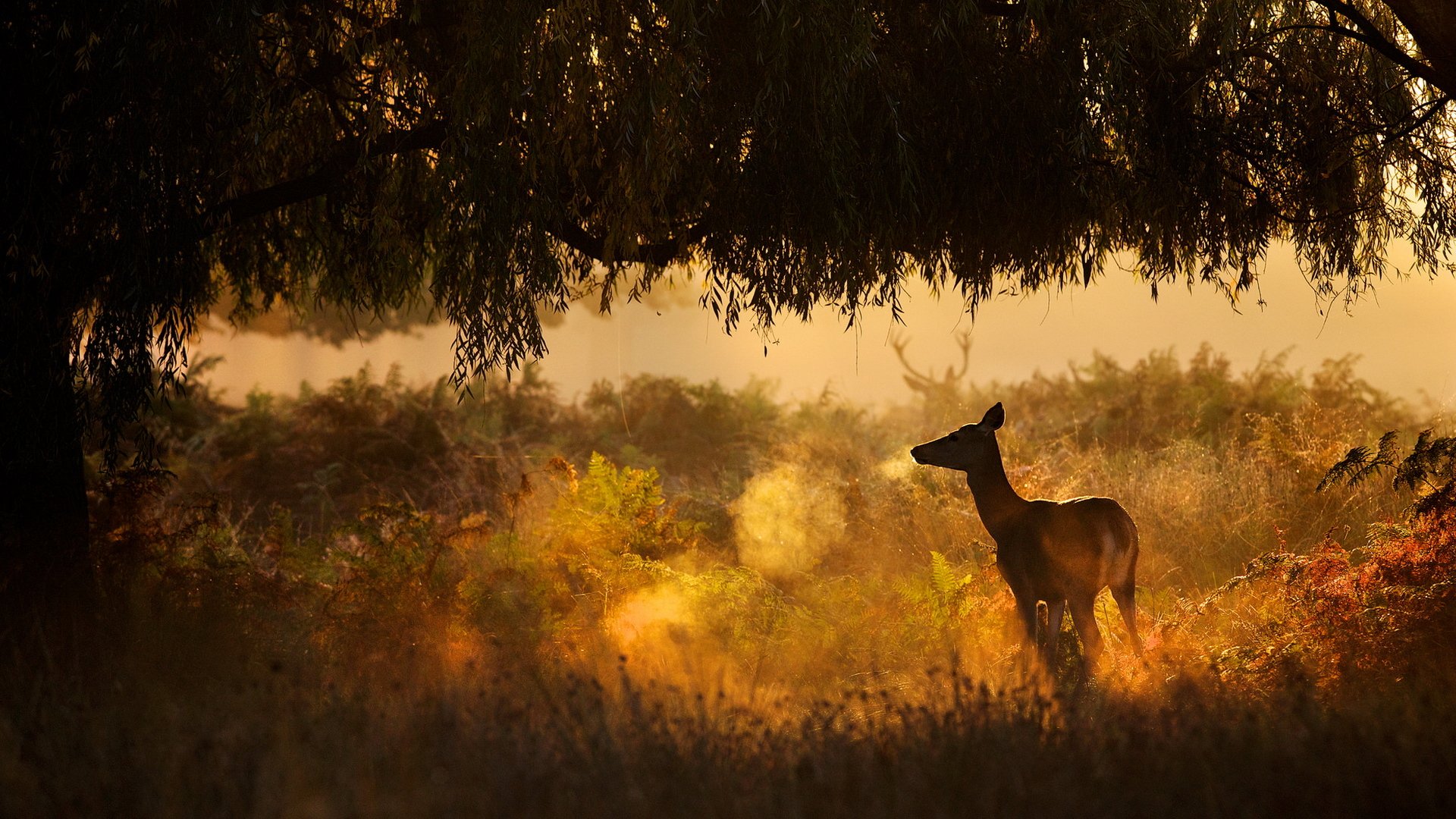 Einsames Rentier bei Sonnenuntergang am Baum