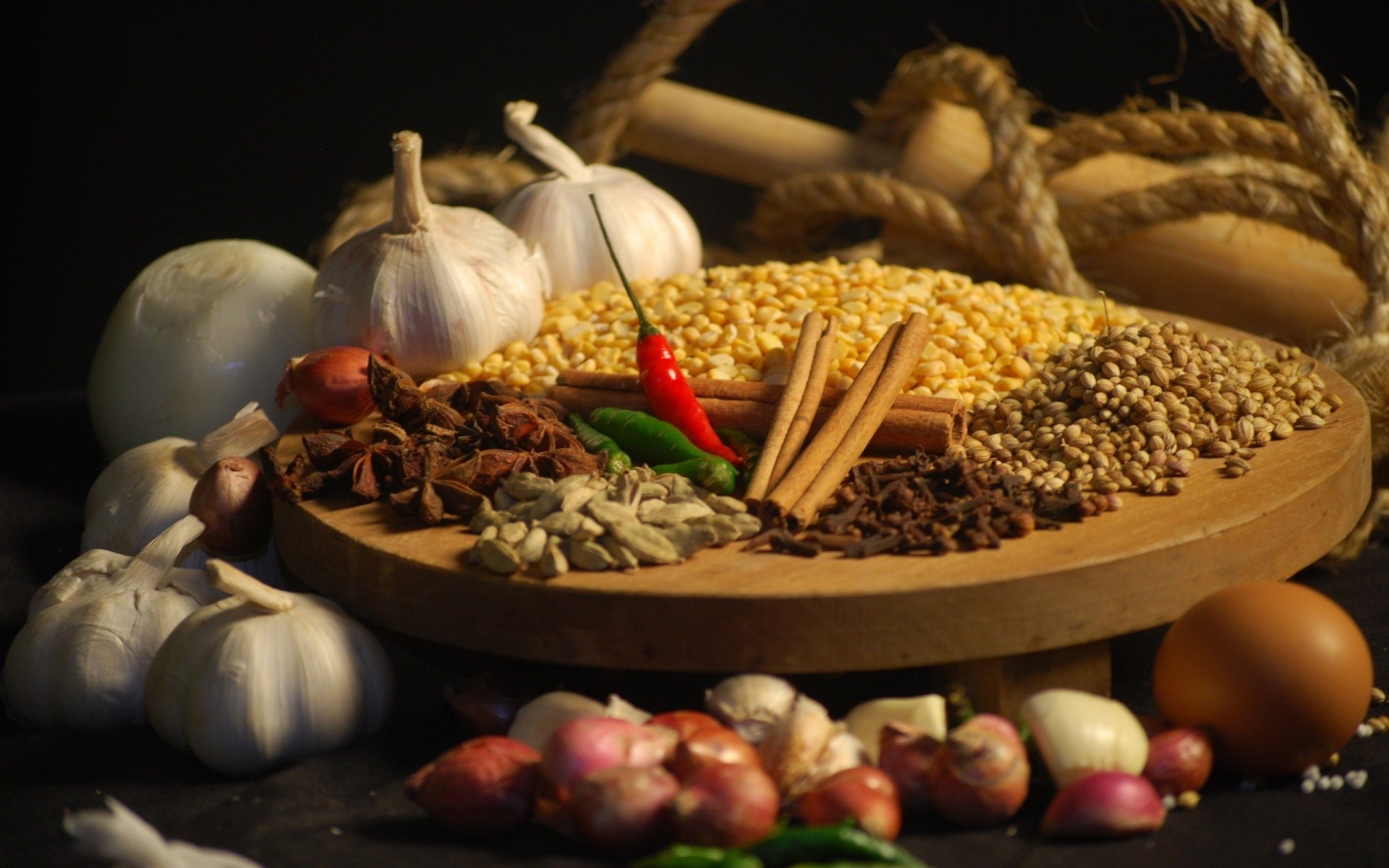 Stillleben mit Gewürzen. Gemahlene Gewürze und Vorrichtungen, um mit ihnen zu arbeiten