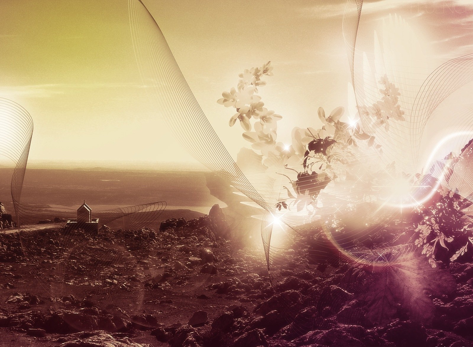 Landschaft mit einer Insel inmitten eines Sees und einem Wald