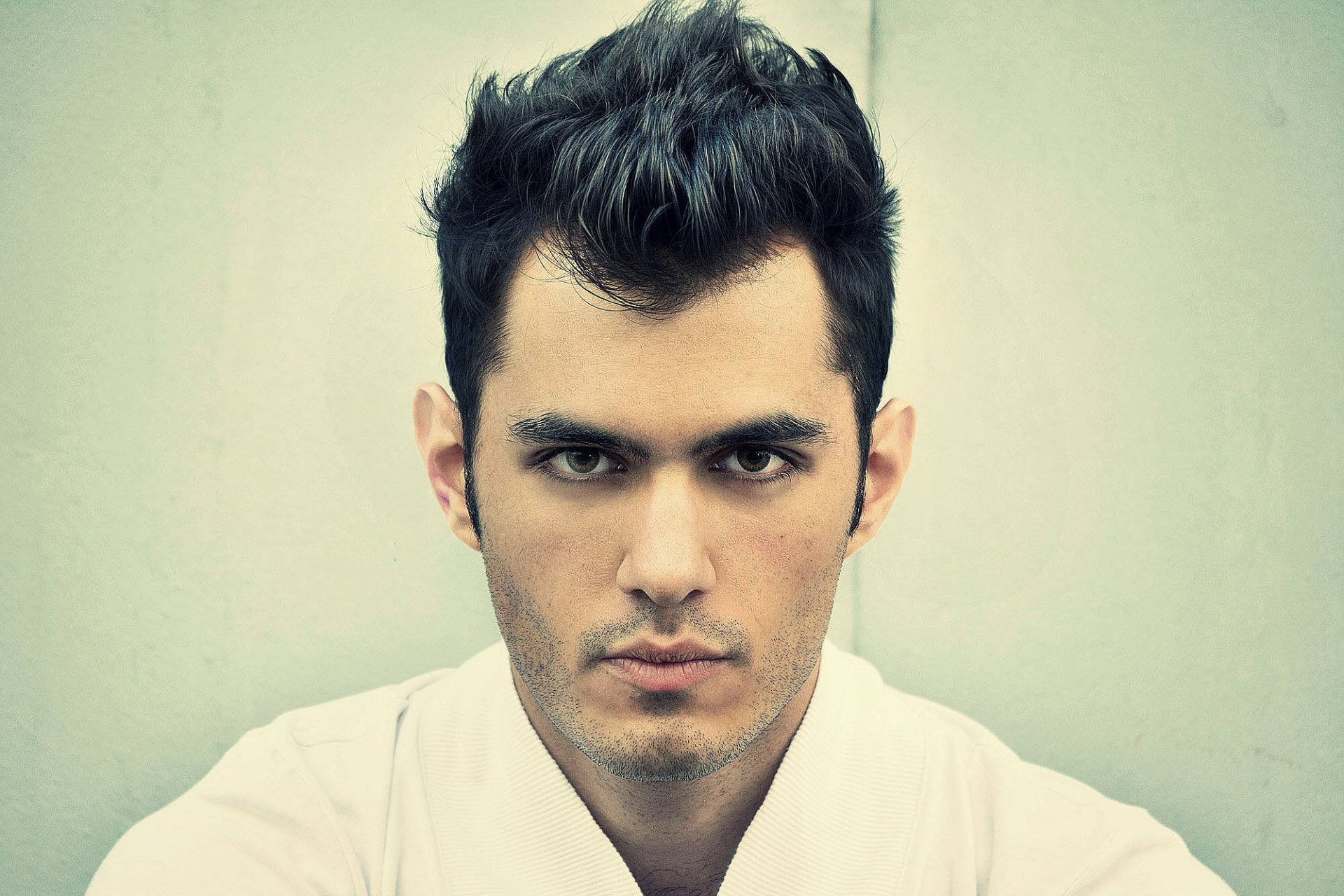Ein junger Mann mit schwarzem Hut, weißem Hemd, schwarzer Krawatte und Hose geht barfuß am Meer unter Perlmuttkugeln spazieren