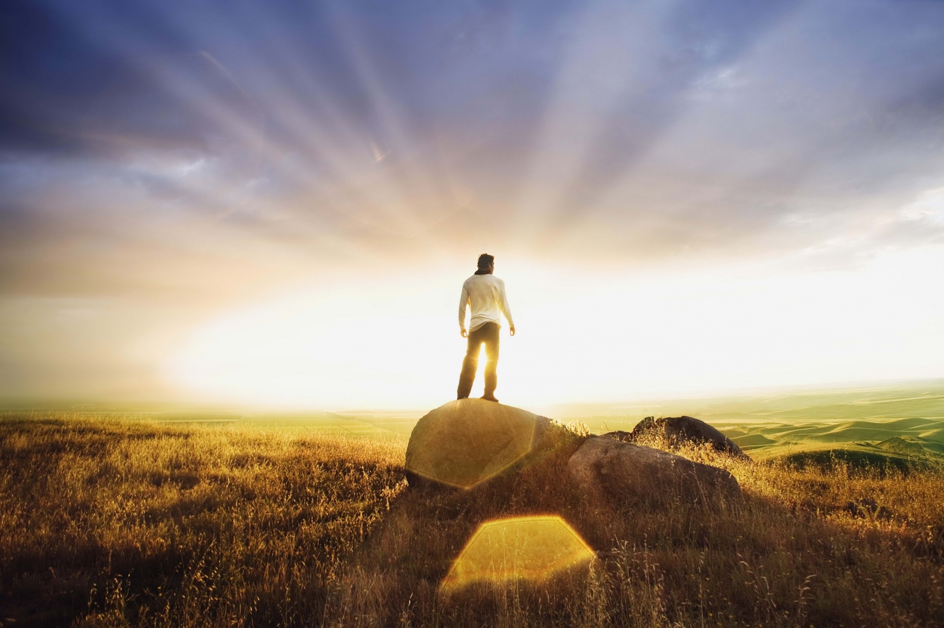 Ein Mann steht auf einem Stein im Sonnenuntergang