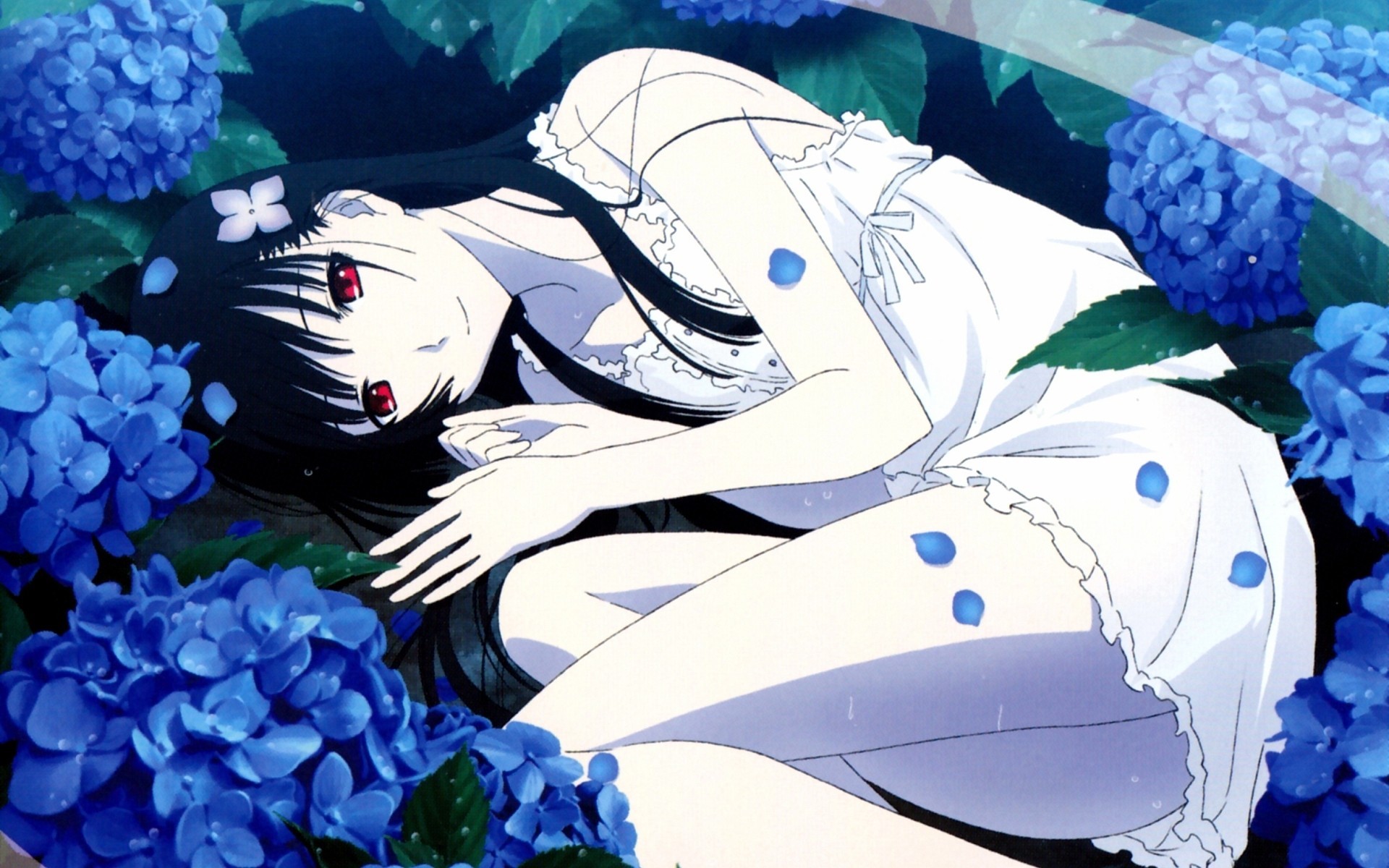 Mädchen mit roten Augen, die in blauen Farben liegen