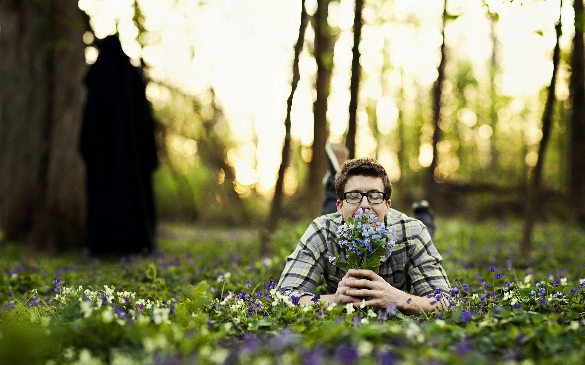 Mann liegt auf einer lichtung im wald mit einem blumenstraußMann liegt auf einer Lichtung im Wald mit einem Blumenstrauß