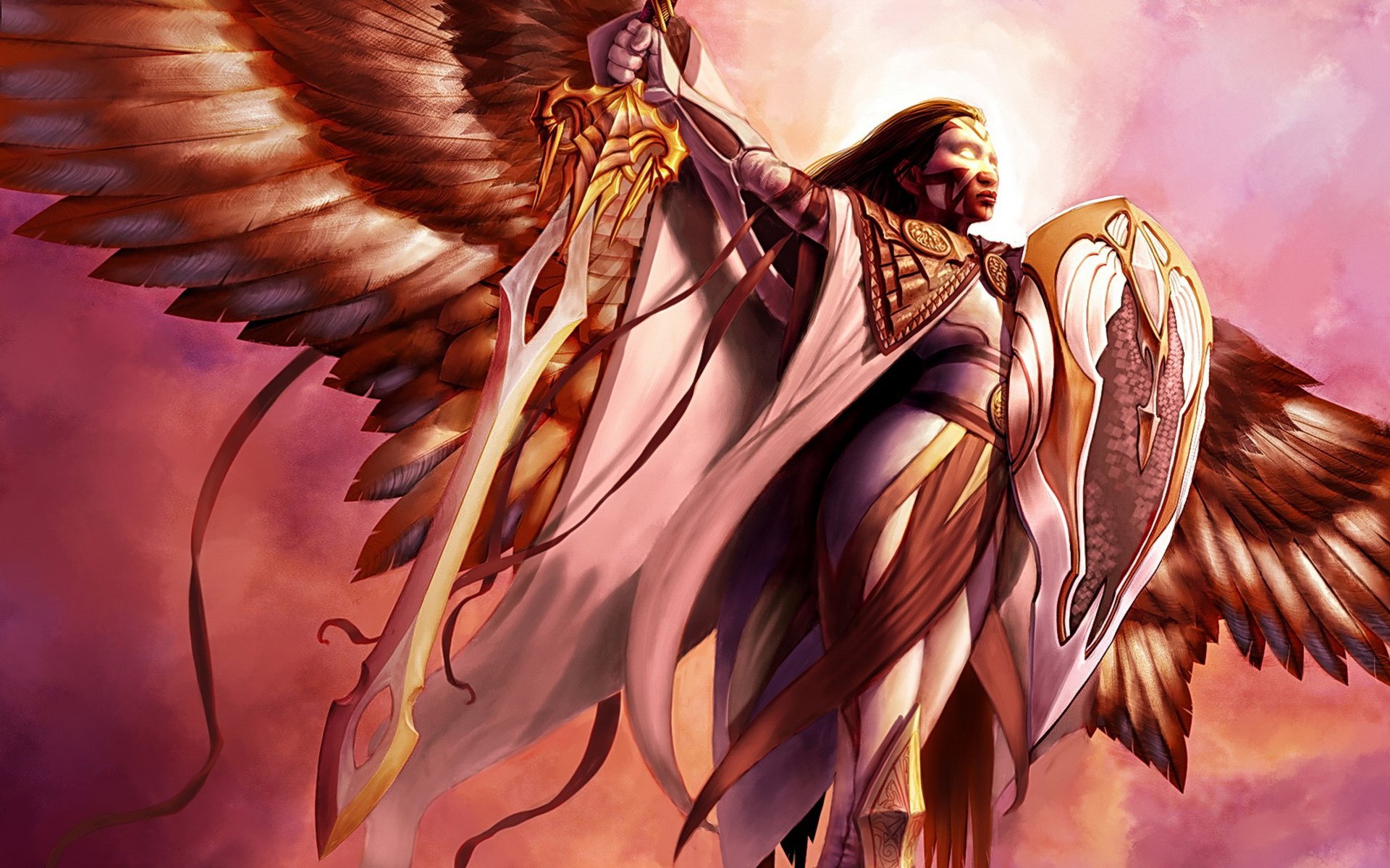 Fantasievolles bild eines mädchens mit flügeln und einem schwert in den händenFantasievolles Bild eines Mädchens mit Flügeln und einem Schwert in den Händen
