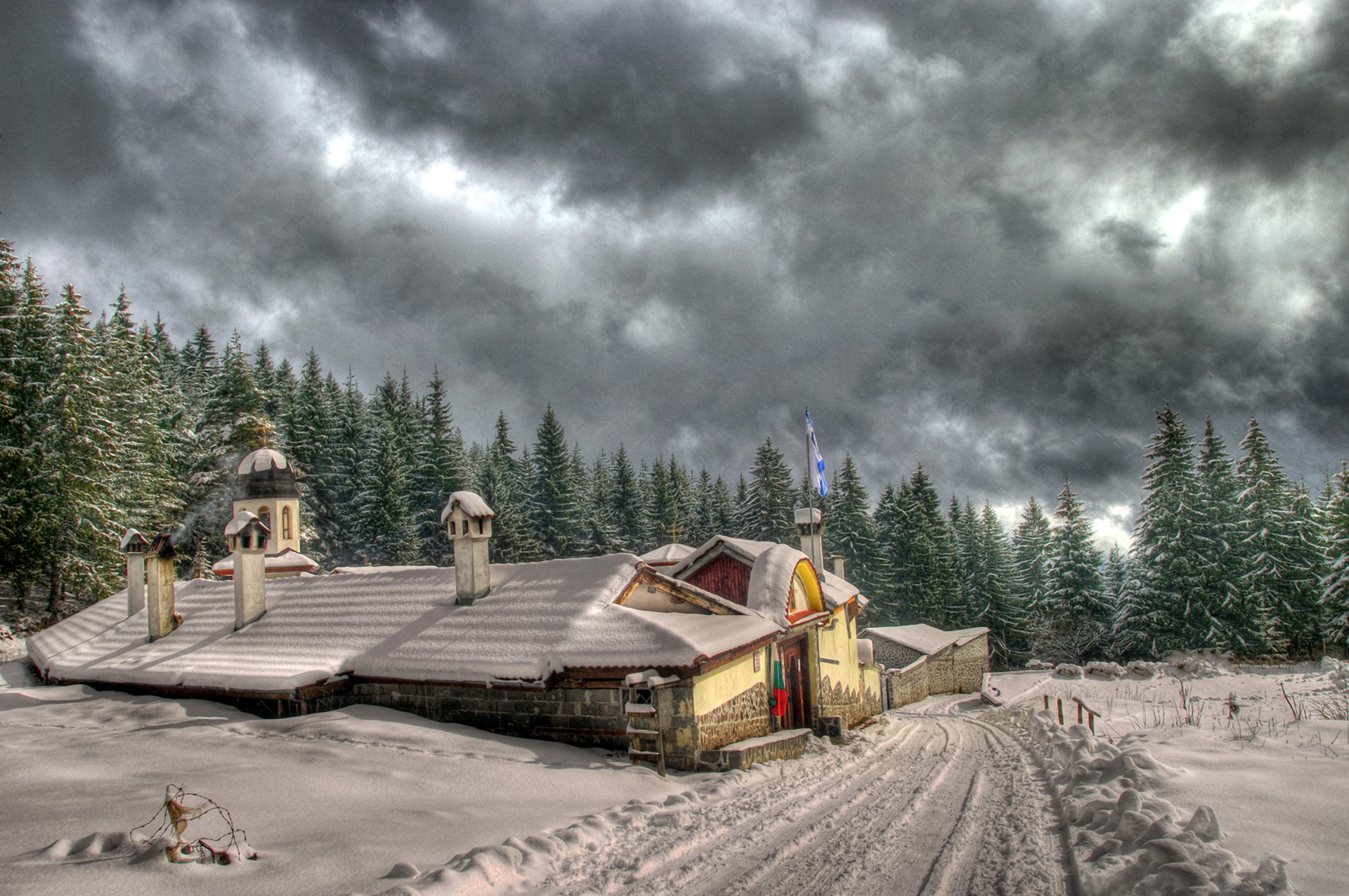 Schneewolken über den Häusern grüne Weihnachtsbäume Schneeverwehungen