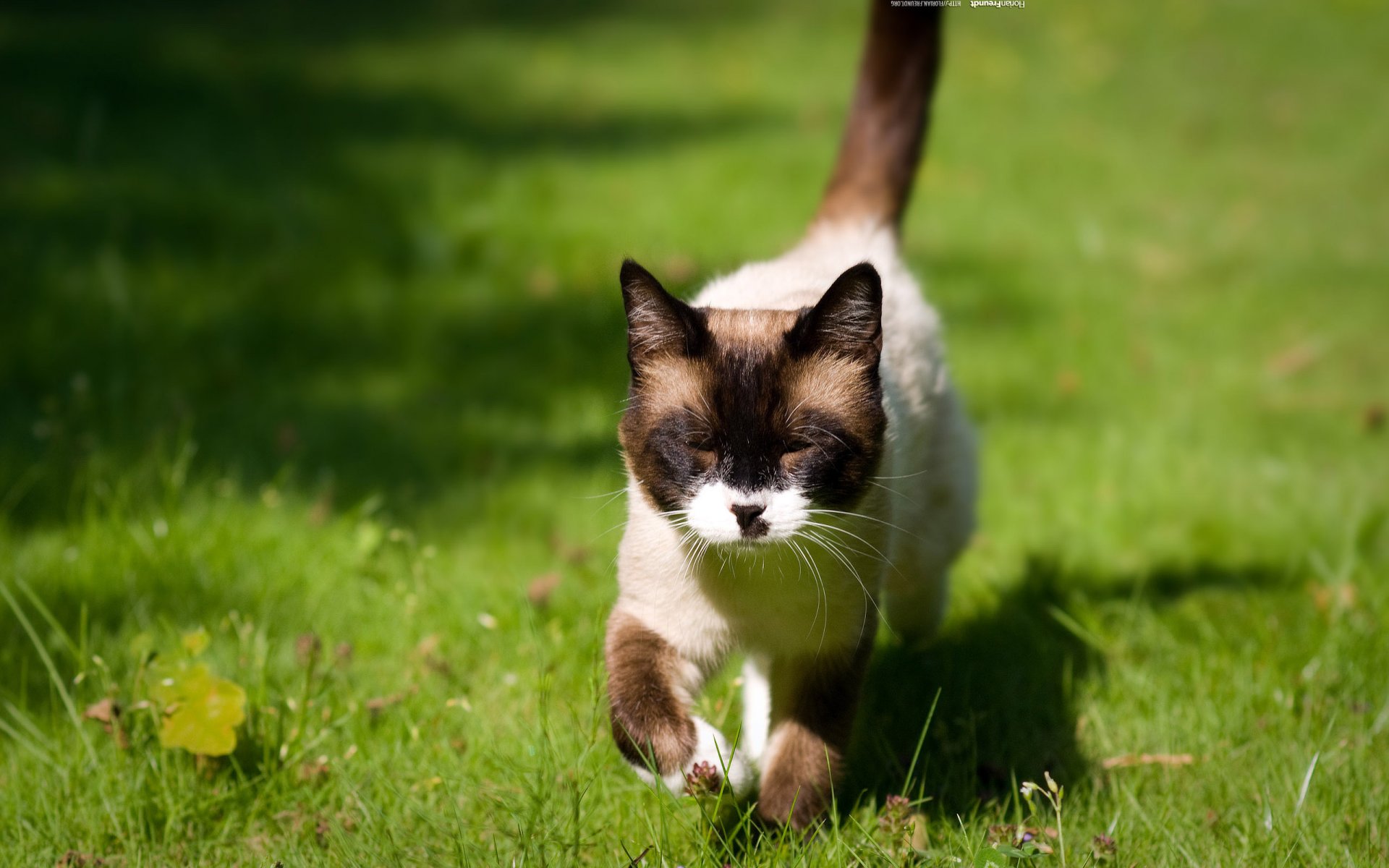 Katze, die an einem sonnigen Tag über das grüne Gras läuft