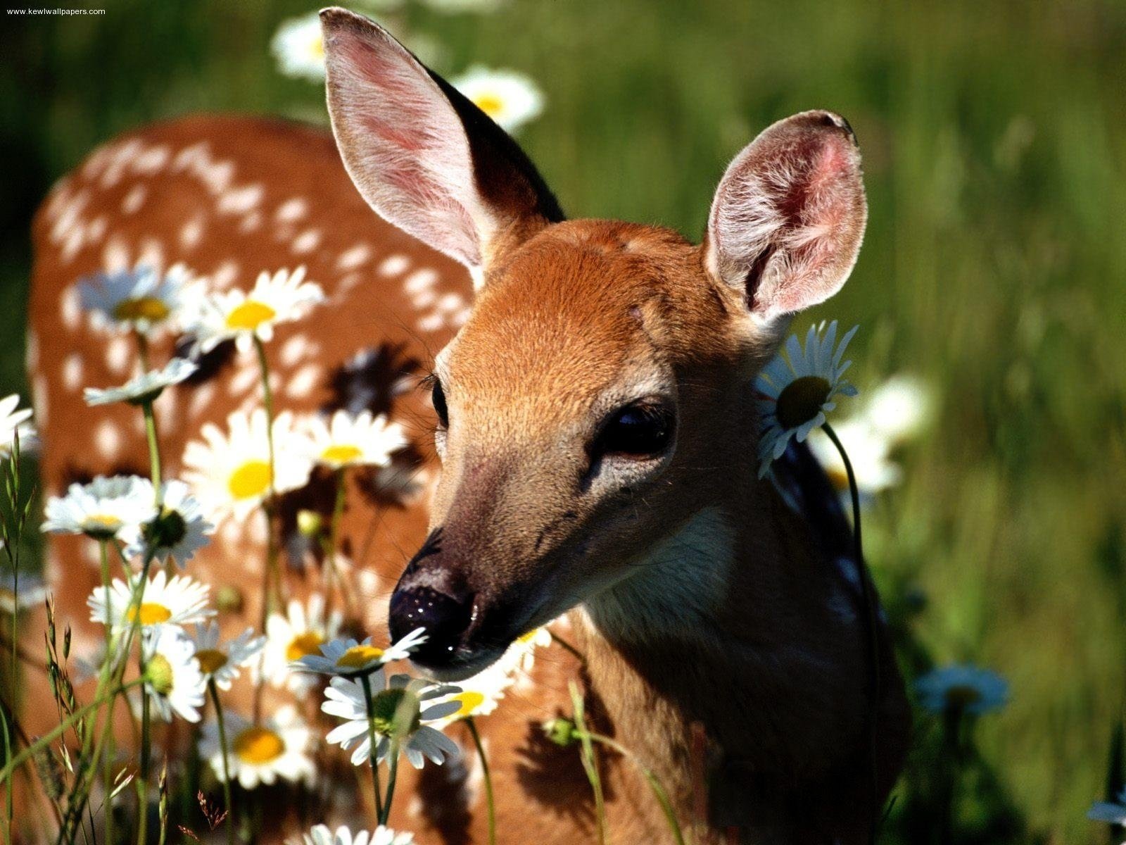 Hirsch schnüffelt Kamille im Gras