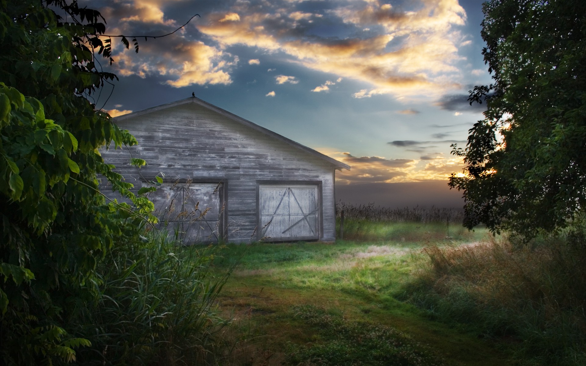 Scheune bei Sonnenuntergang in einem sauberen Feld