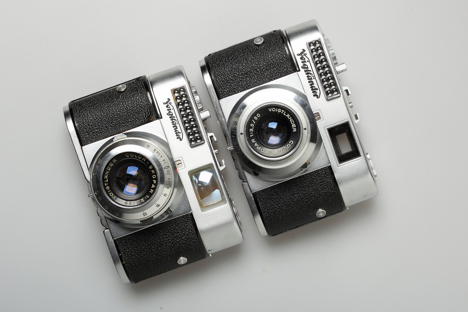 Ein paar makrokameras auf einem einfarbigen grauen hintergrundEin paar Makrokameras auf einem einfarbigen grauen Hintergrund