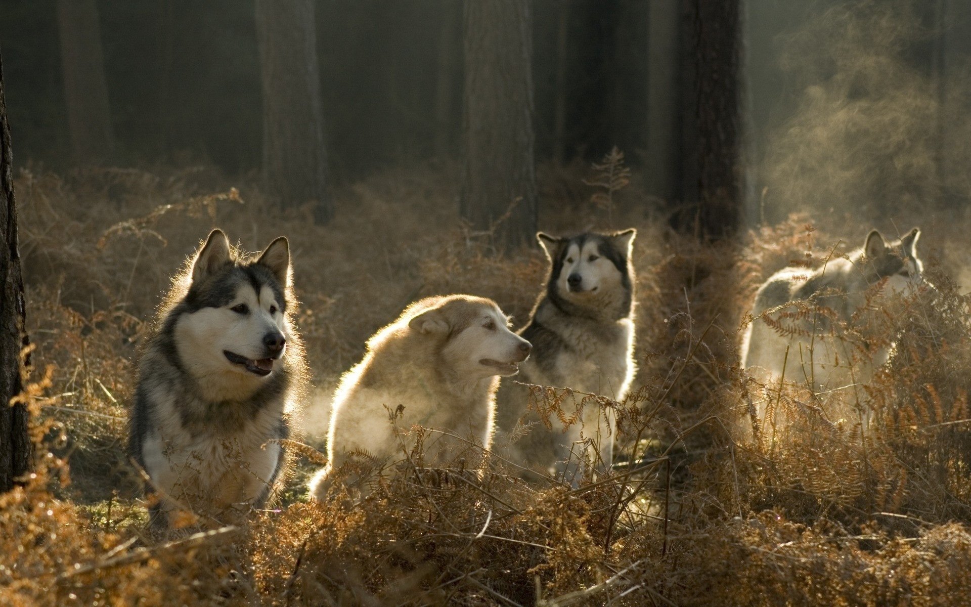 Eine herde von wölfen an einem sonnigen tag. im waldEine Herde von Wölfen an einem sonnigen Tag. Im Wald