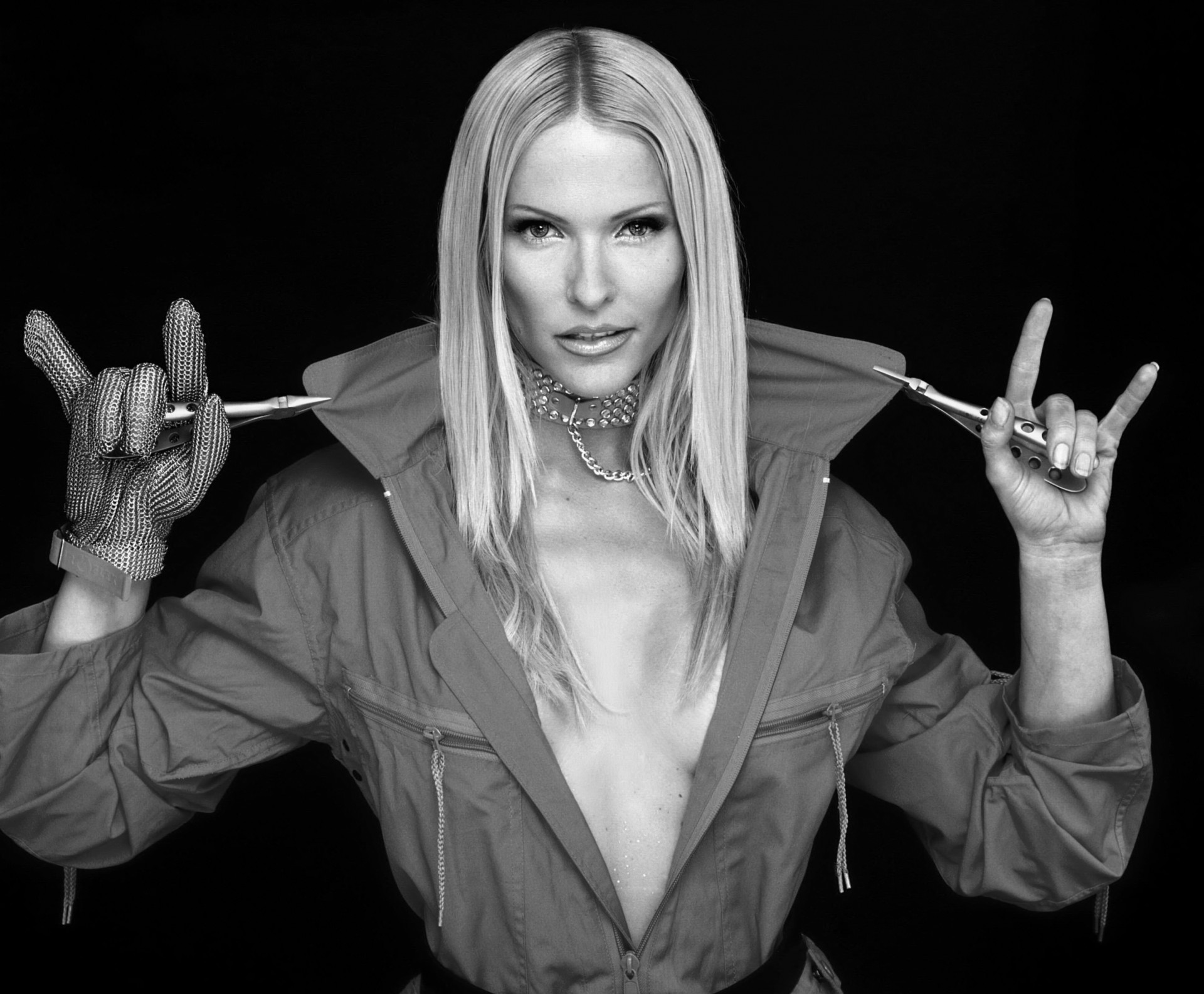 Schwarz-weißes mädchen mit coolem look, finger von weyar im handschuhSchwarz-weißes Mädchen mit coolem Look, finger von Weyar im Handschuh