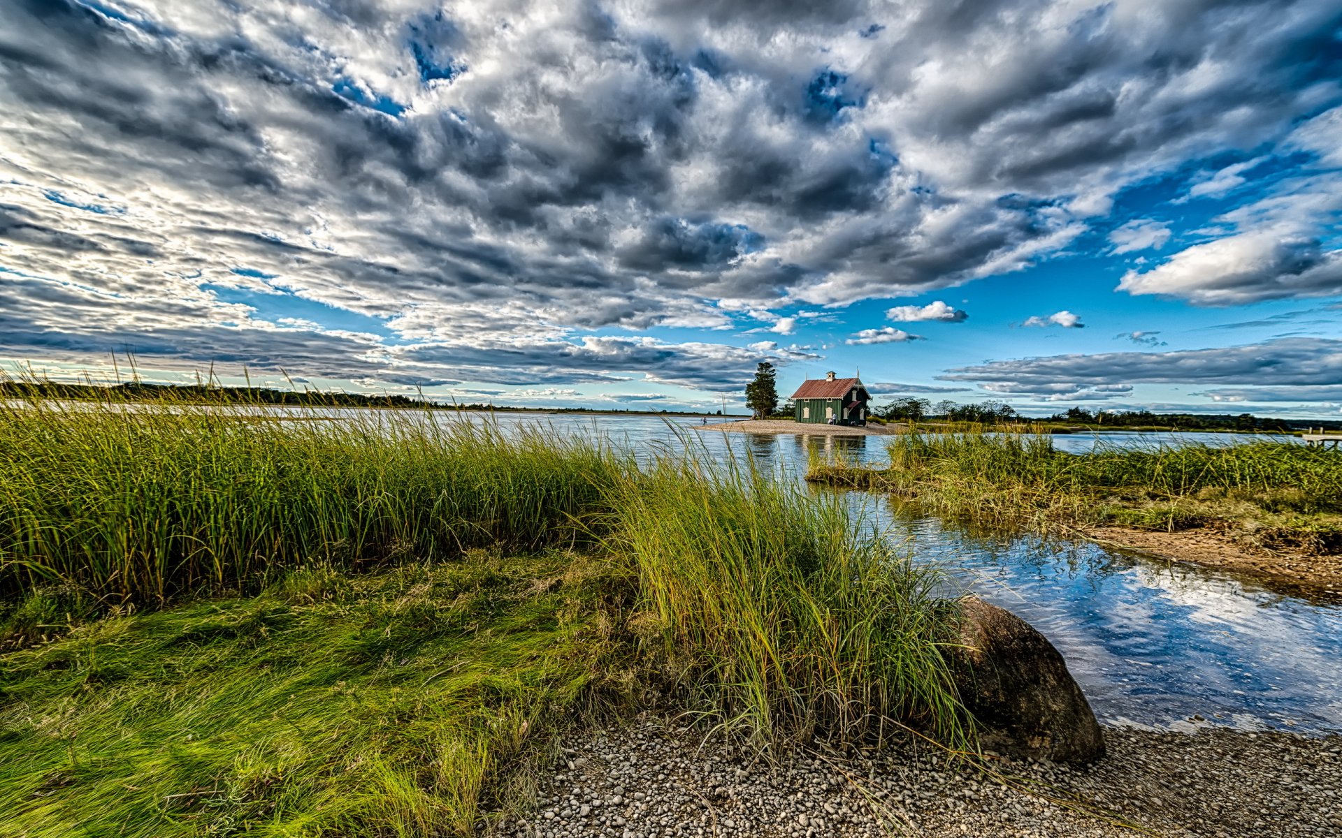 Ein Fluss und eine Hütte mit einem Haus am Fluss