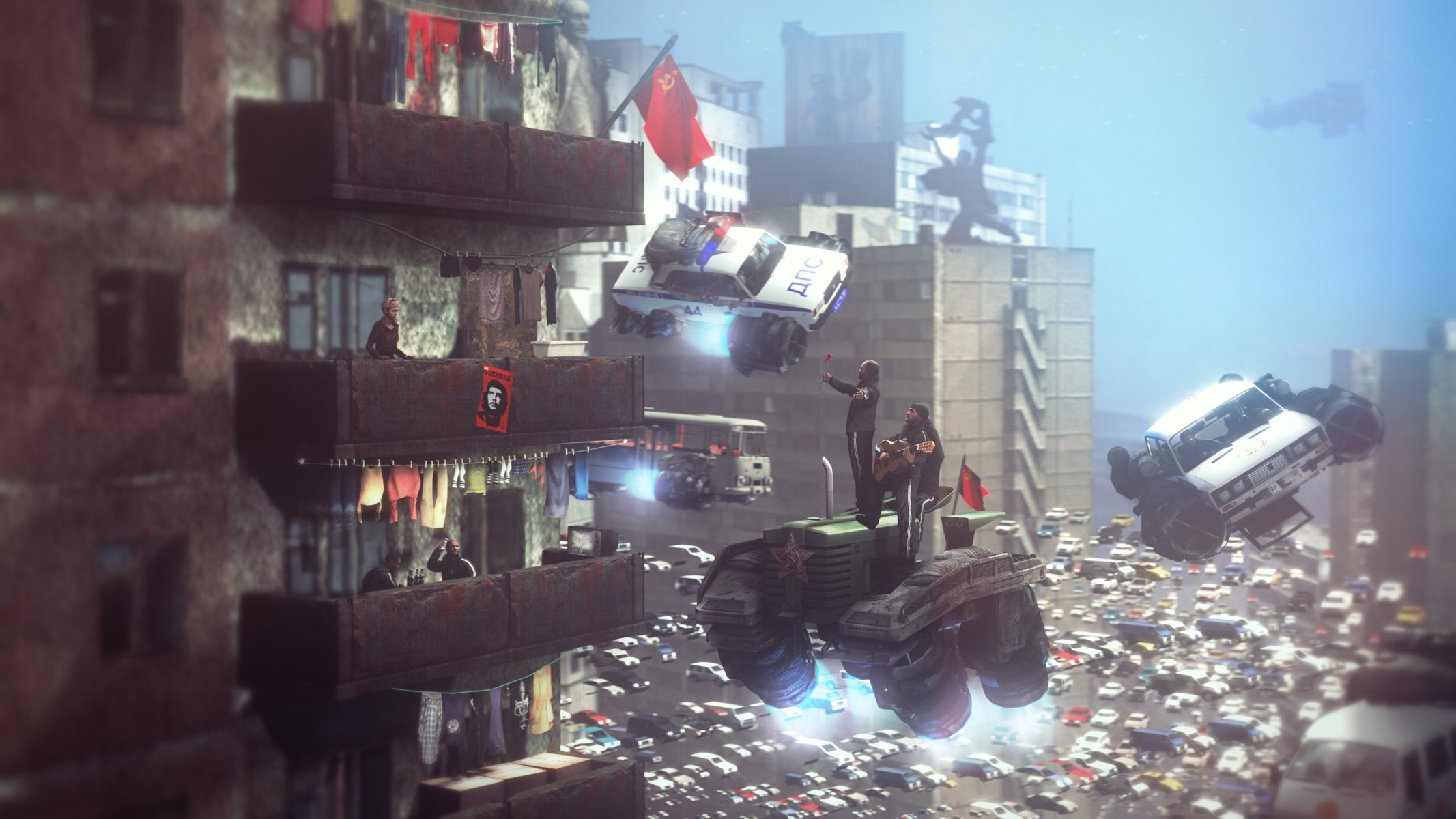 Mädchen auf dem Balkon in einem zerstörten Haus und Männer in einem Militärtransport