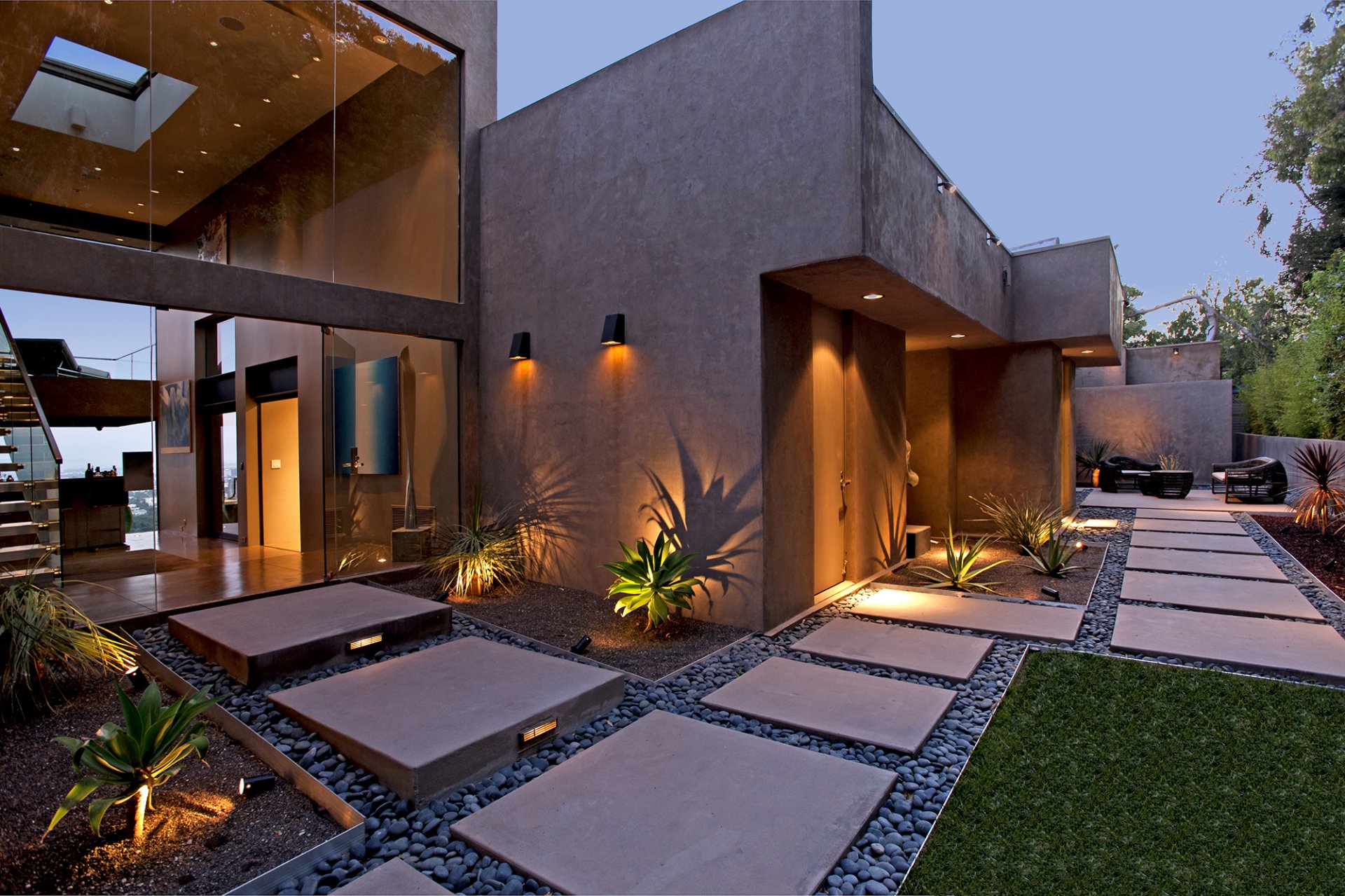 Das Haus ist mit einem Zaun und grünem Gras umgeben