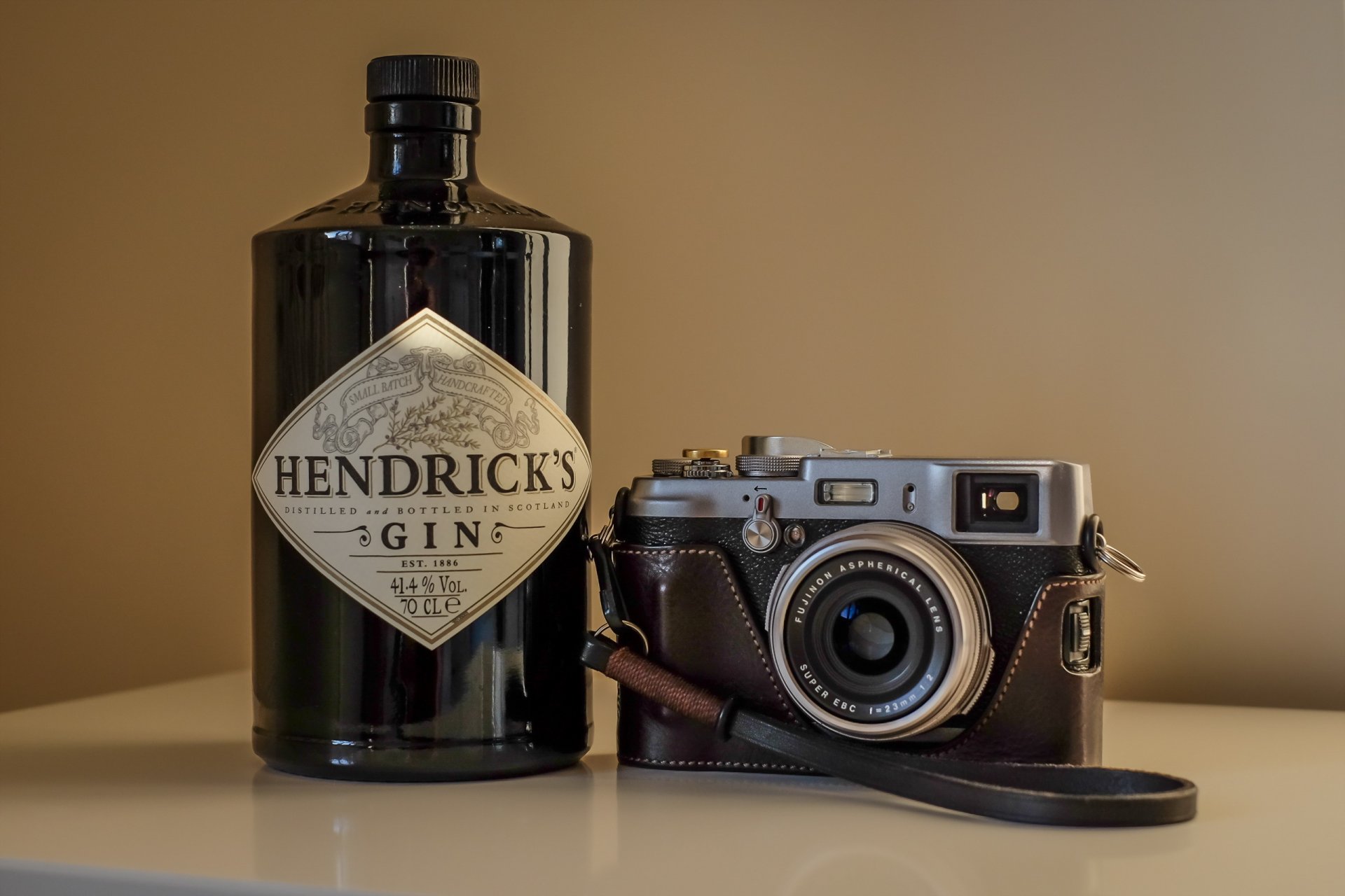 Kamera im Koffer auf dem Hintergrund einer Flasche Gin
