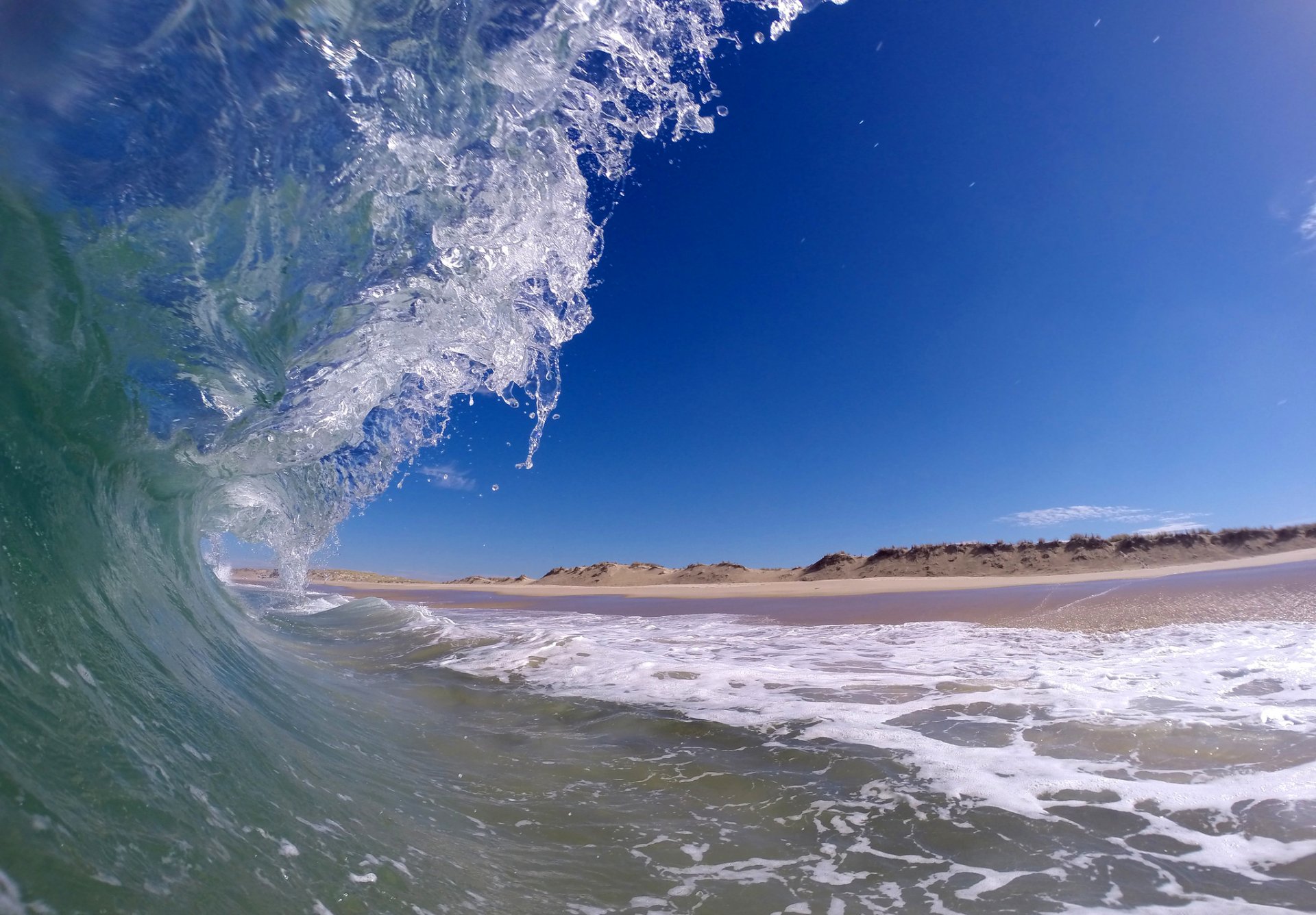 Eine Kamera im Sand, die mit einer Welle weggespült wird