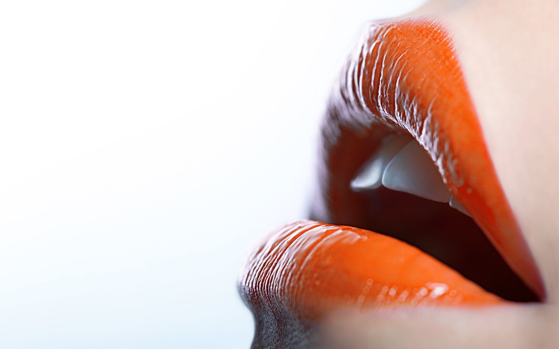 Roter Lippenstift auf den Lippen einer Blondine in Nahaufnahme