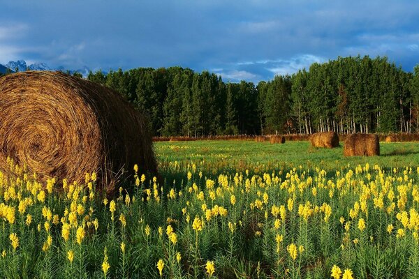 Feld mit Blumen und Heu mit Bergen im Hintergrund