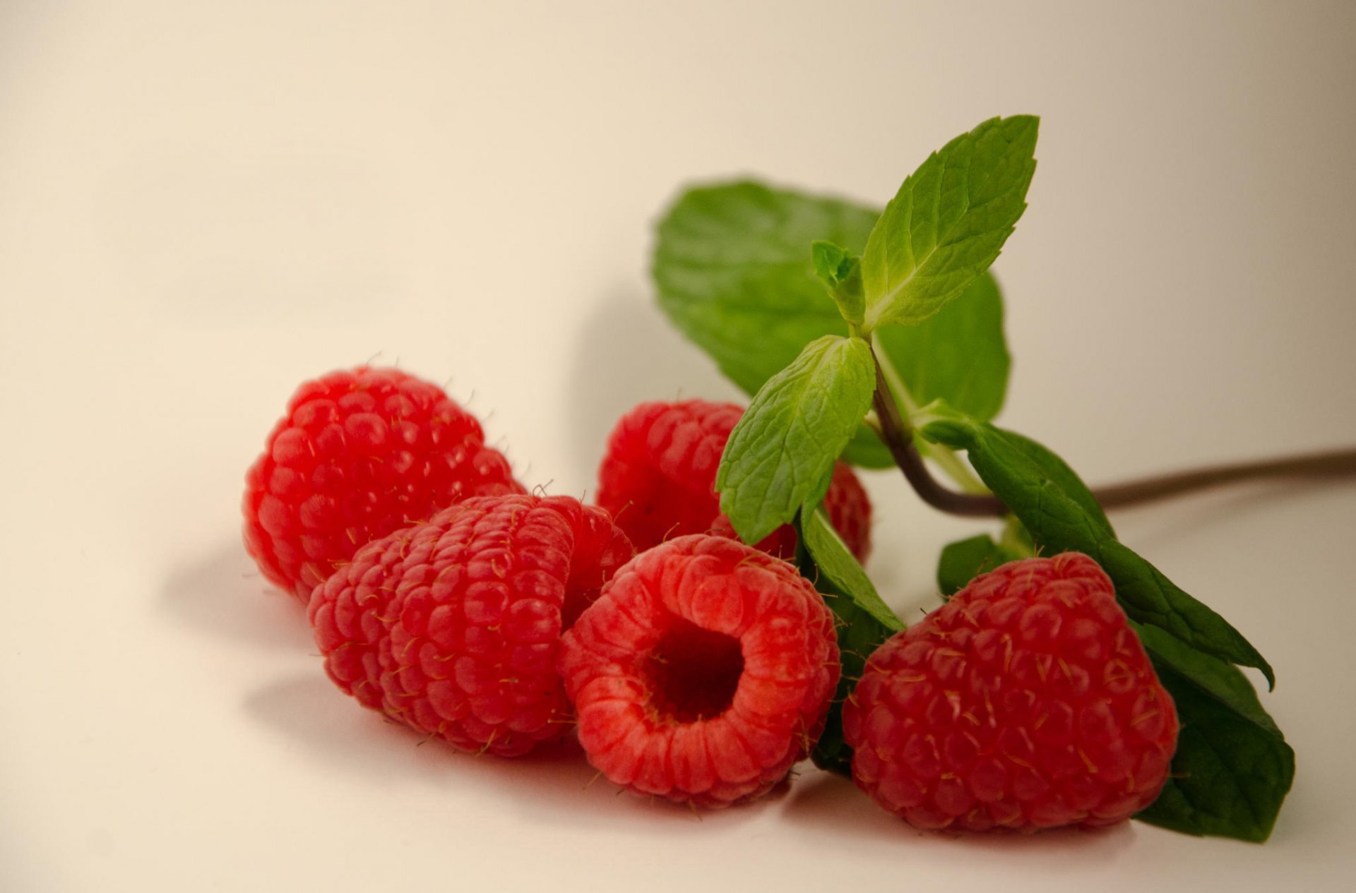 Frische Himbeeren mit Blättern liegen auf dem Tisch