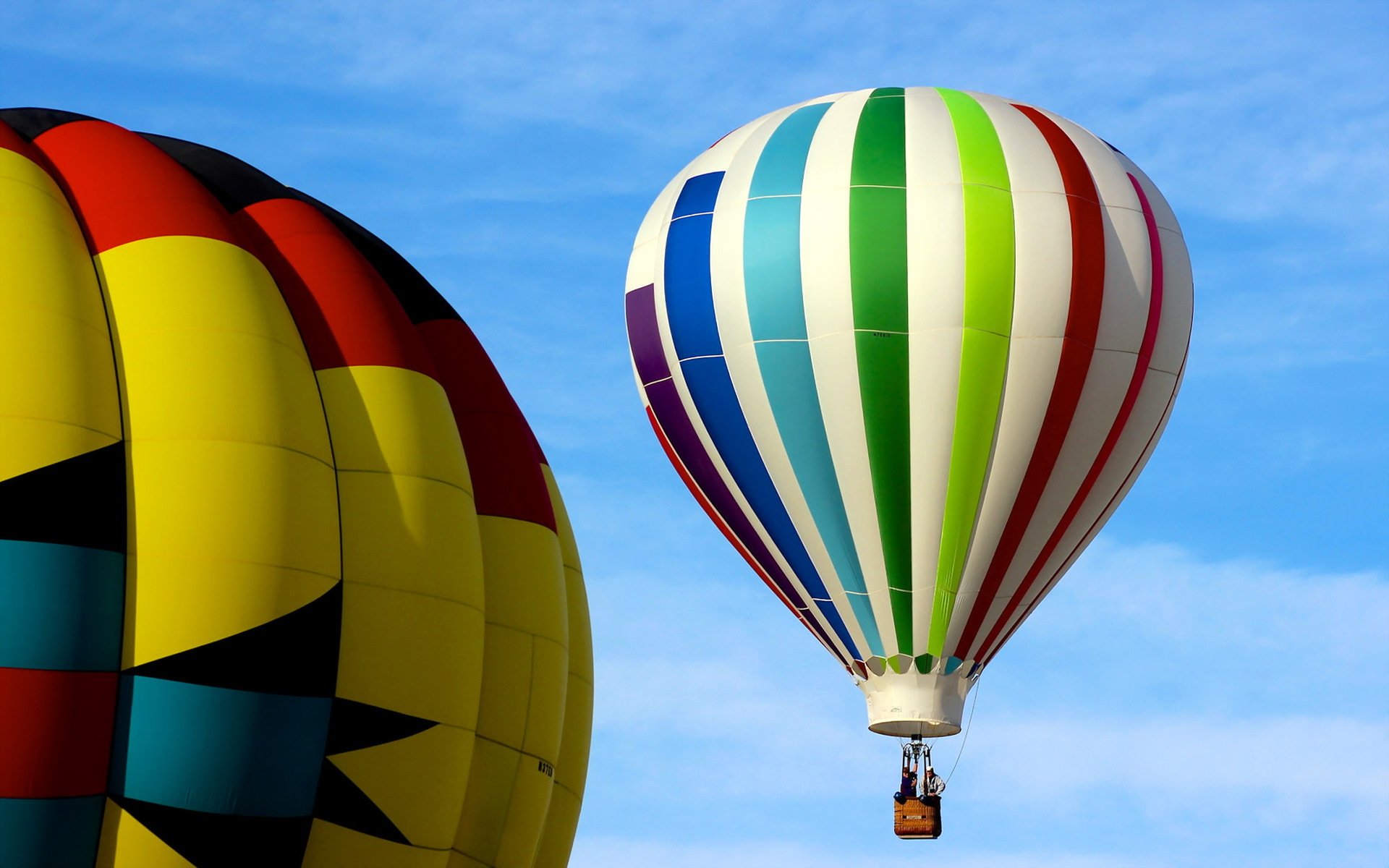 Fünf farbige Ballons fliegen über den blauen Himmel